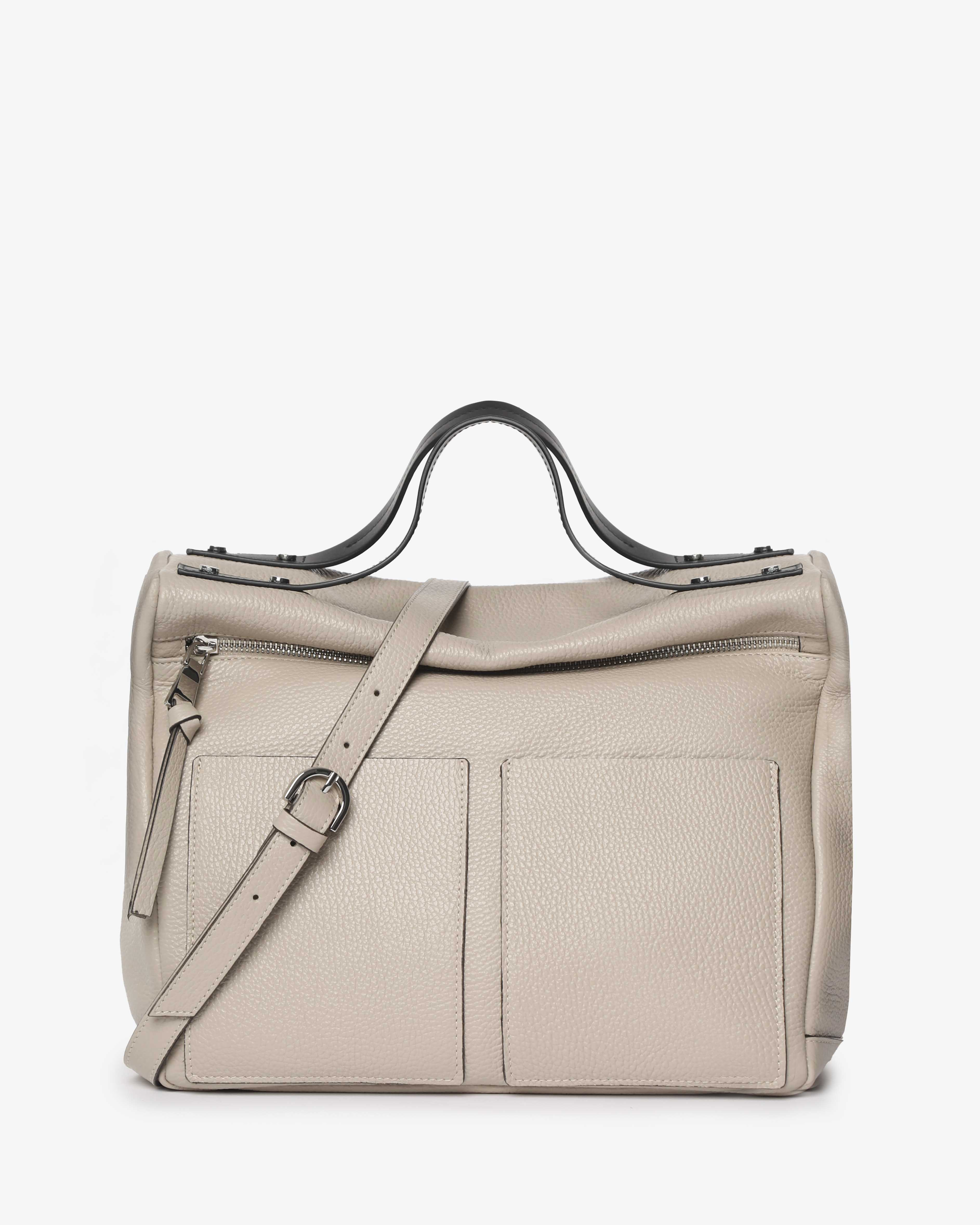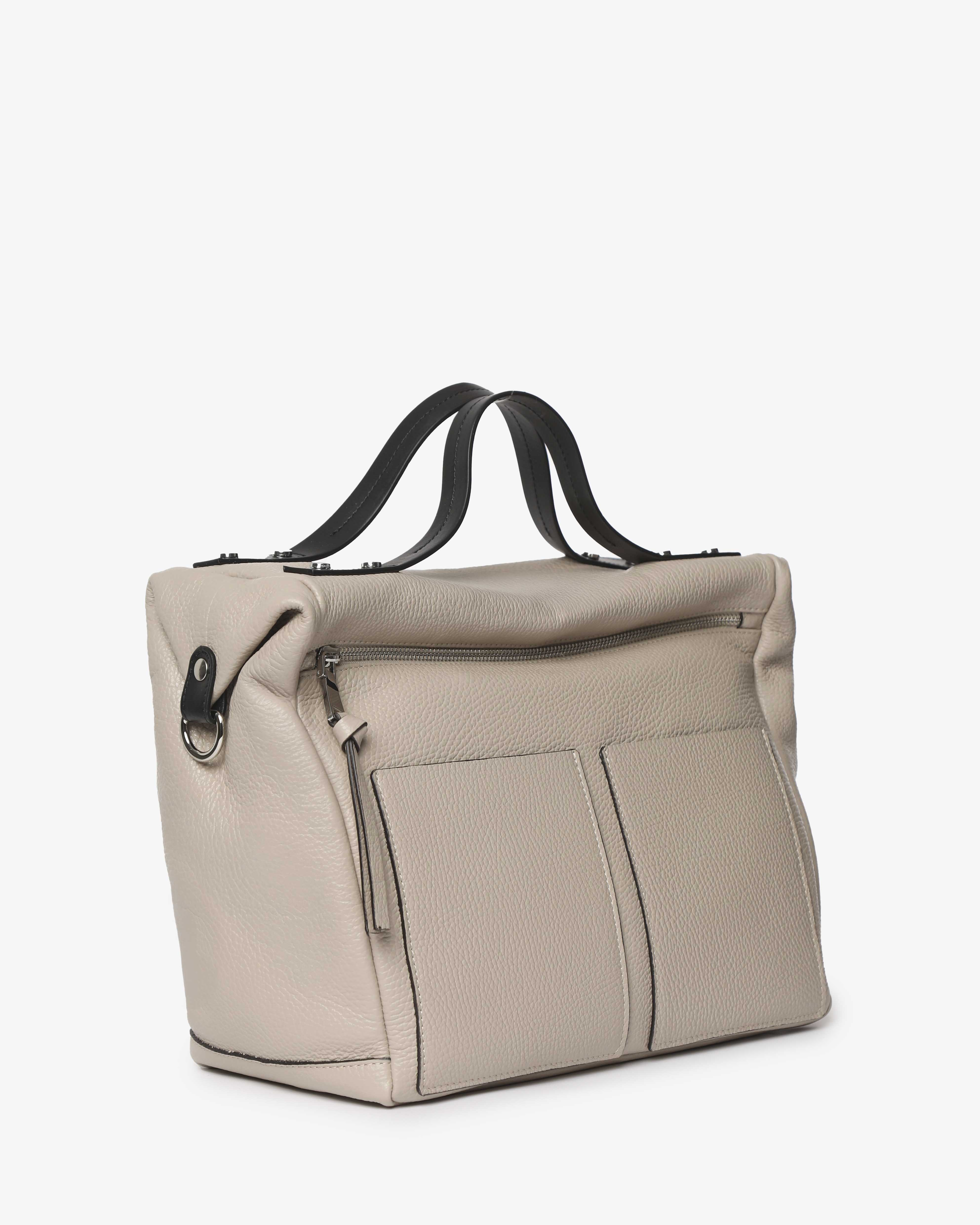 Two-handle "Dakota" handbag by Gianni Notaro made of soft hammered leather, with details of its handles in smooth black cowhide. Enhanced by 2 external pockets and its side details.