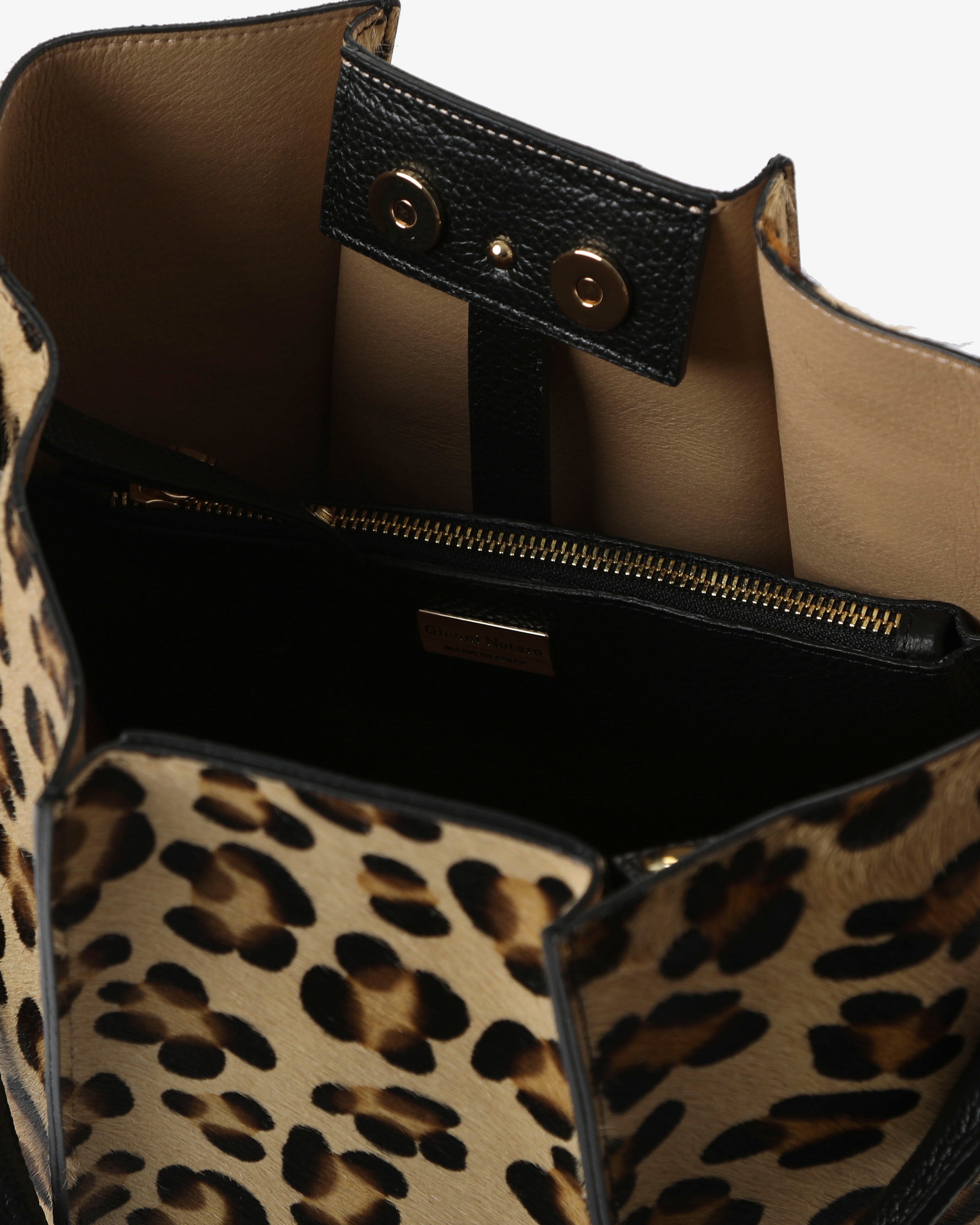 Bora Hobo "AMELIE" di Gianni Notaro realizzata in pelle martellata e in cavallino leopardato, è caratterizzata dall'abbinamento di materiali che la rende femminile e contemporanea. Dotata di soffietto laterale che aumenta l'apertura della borsa. Comoda e funzionale da portare a spalla, si adatta perfettamente ad ogni tipo di occasione.