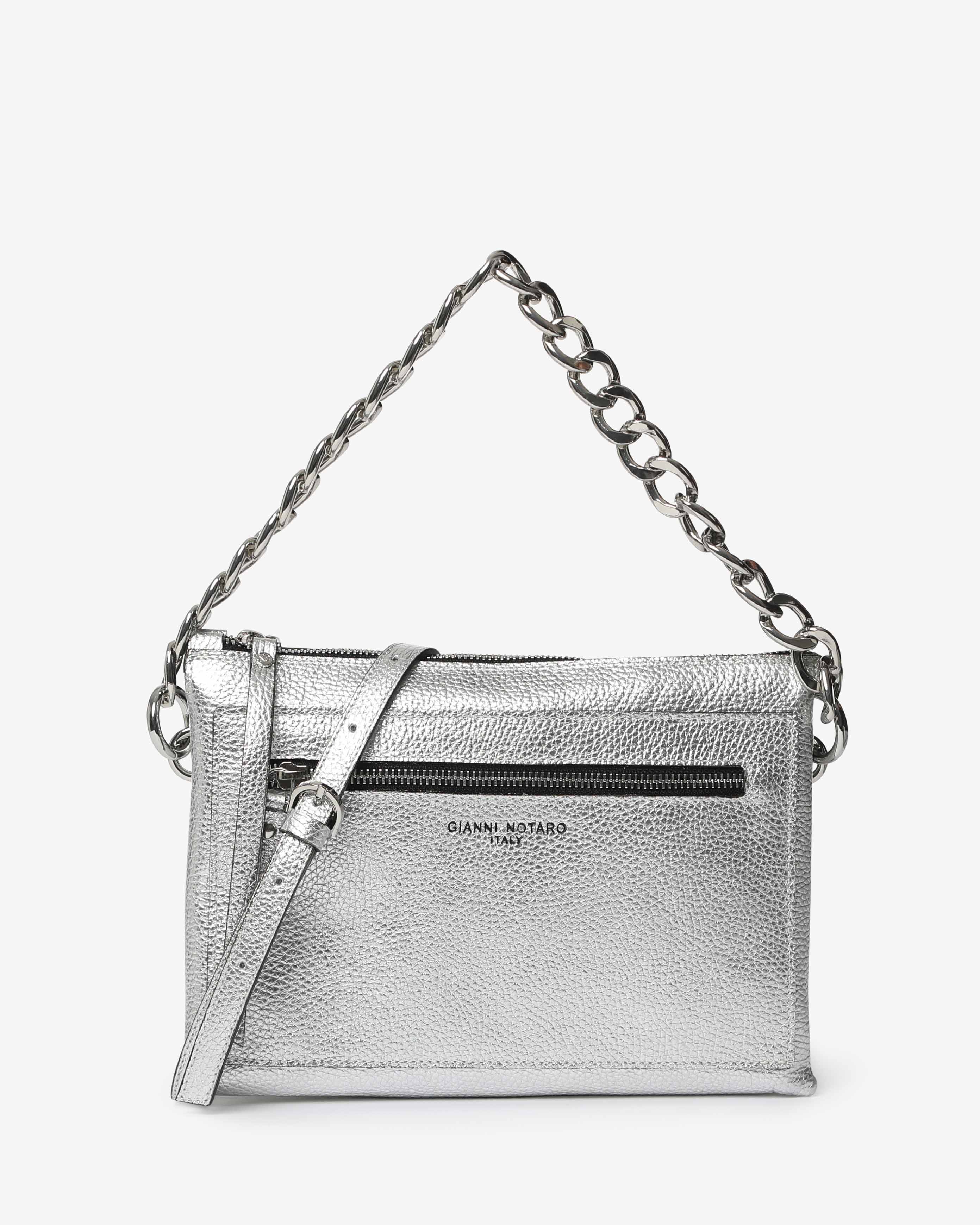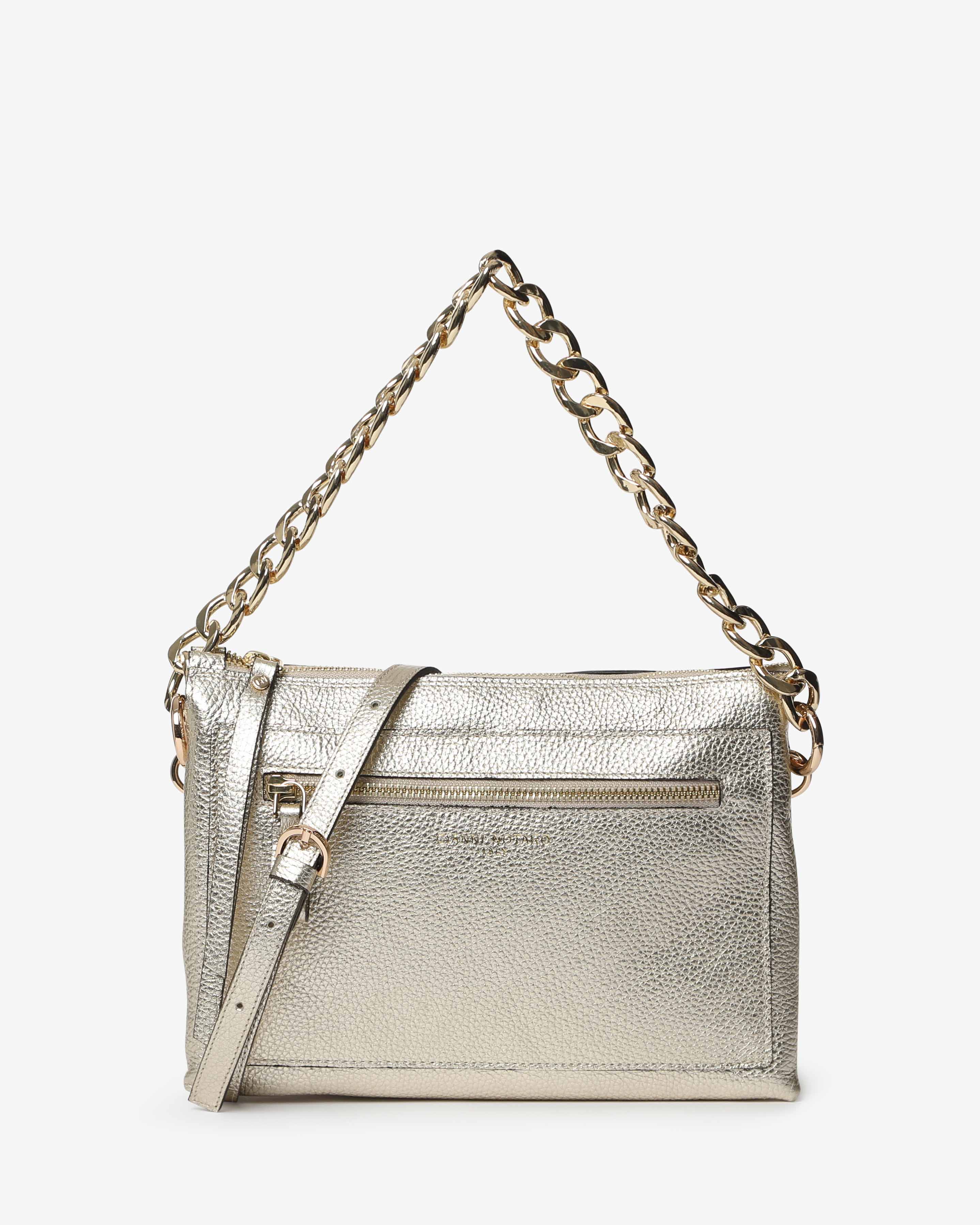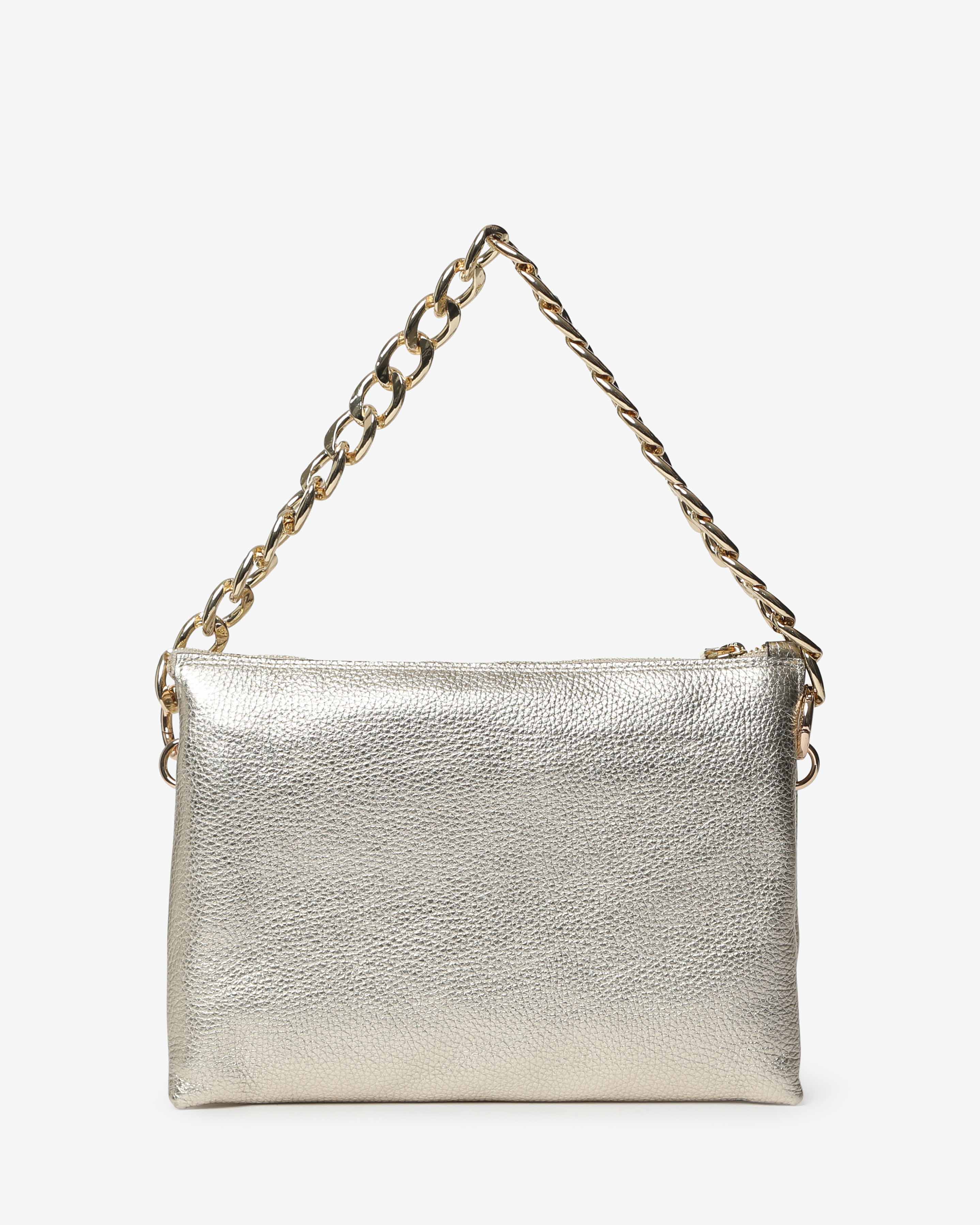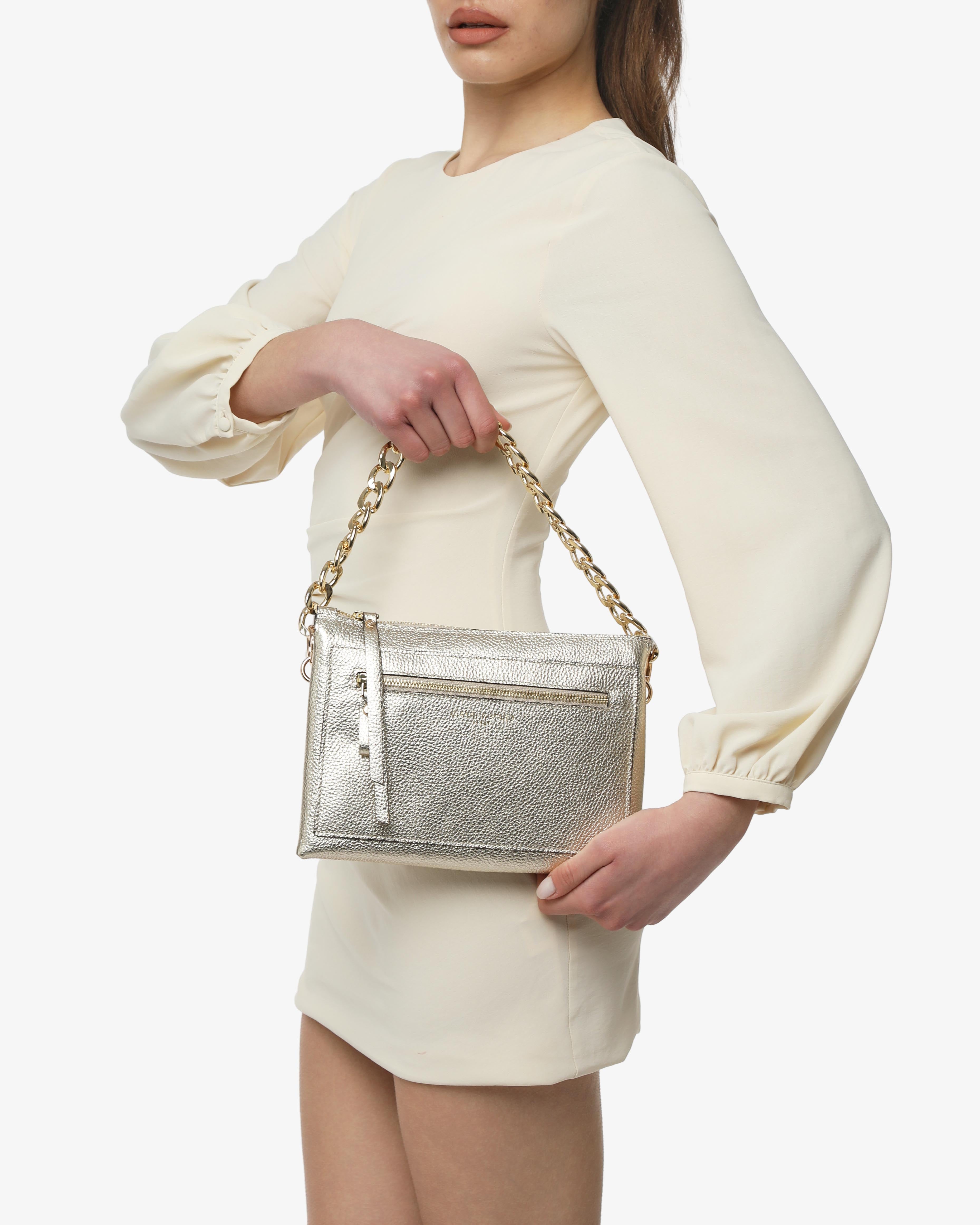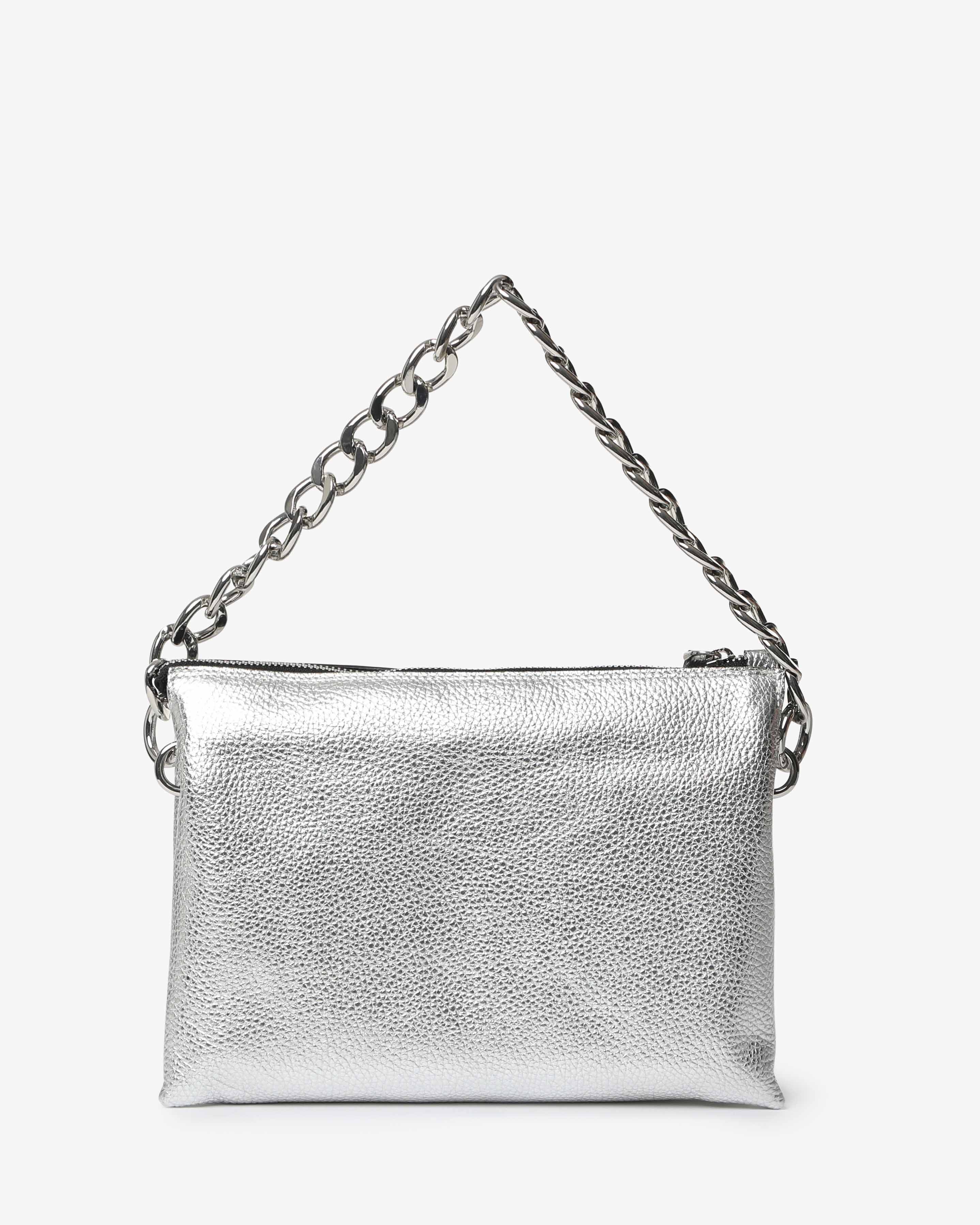 Athena è la borsa a spalla in pelle martellata dal design elegante e contemporaneo. Dotata di tracolla in catena e dettagli zip frontale, unisce praticità e stile per un look sofisticato, da giorno e sera.