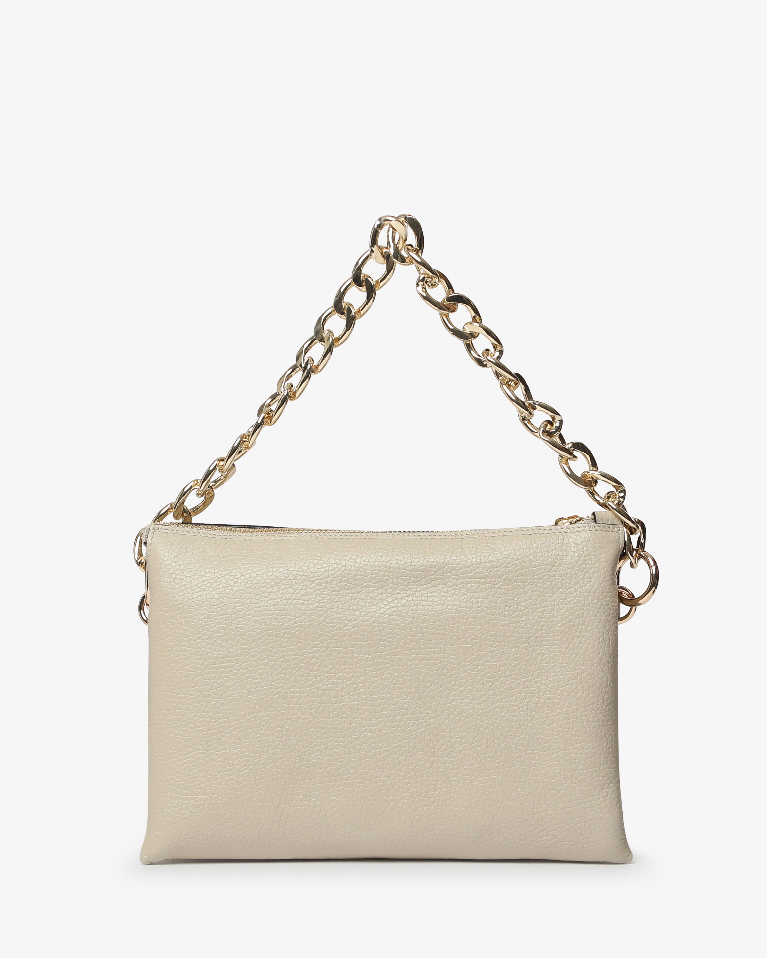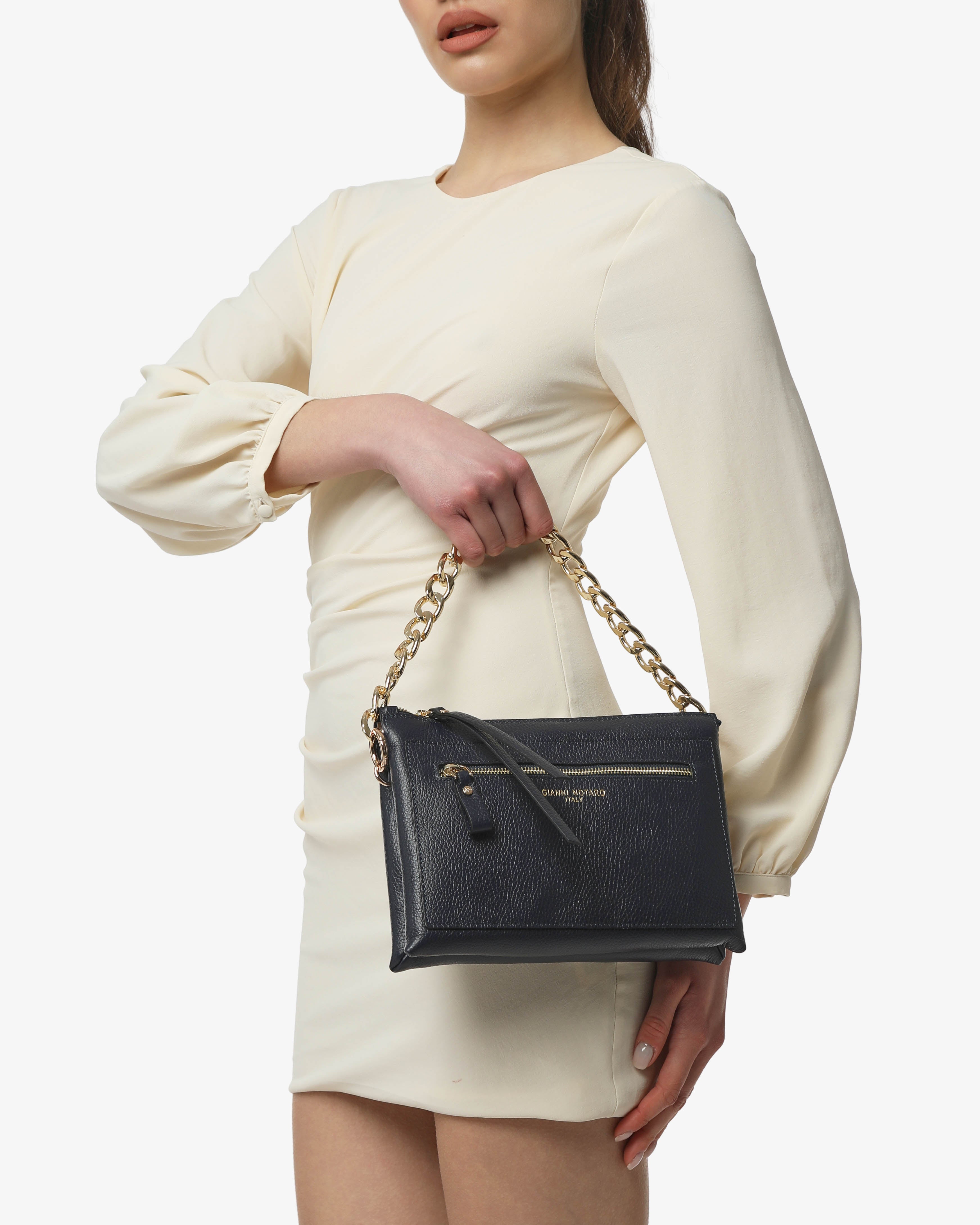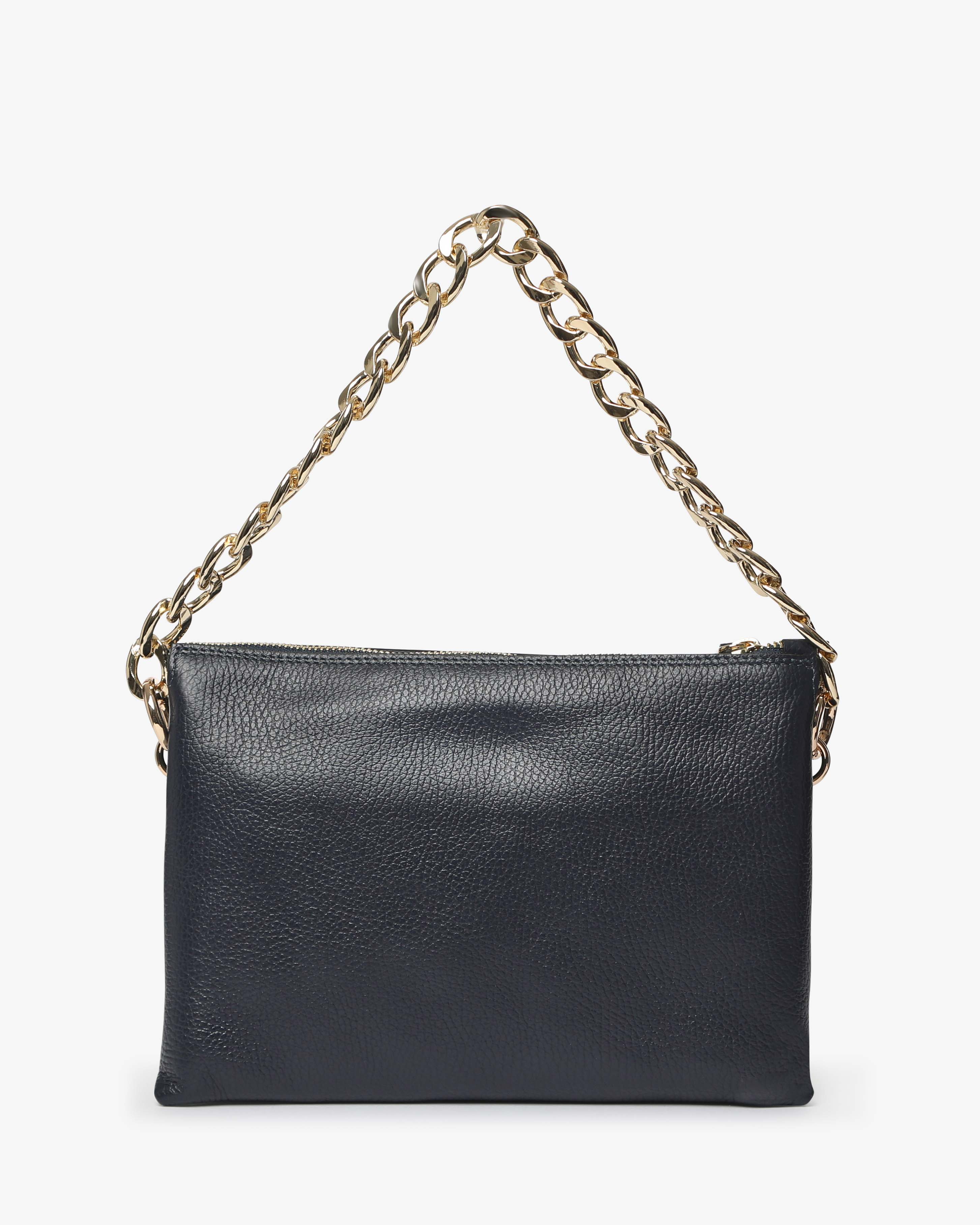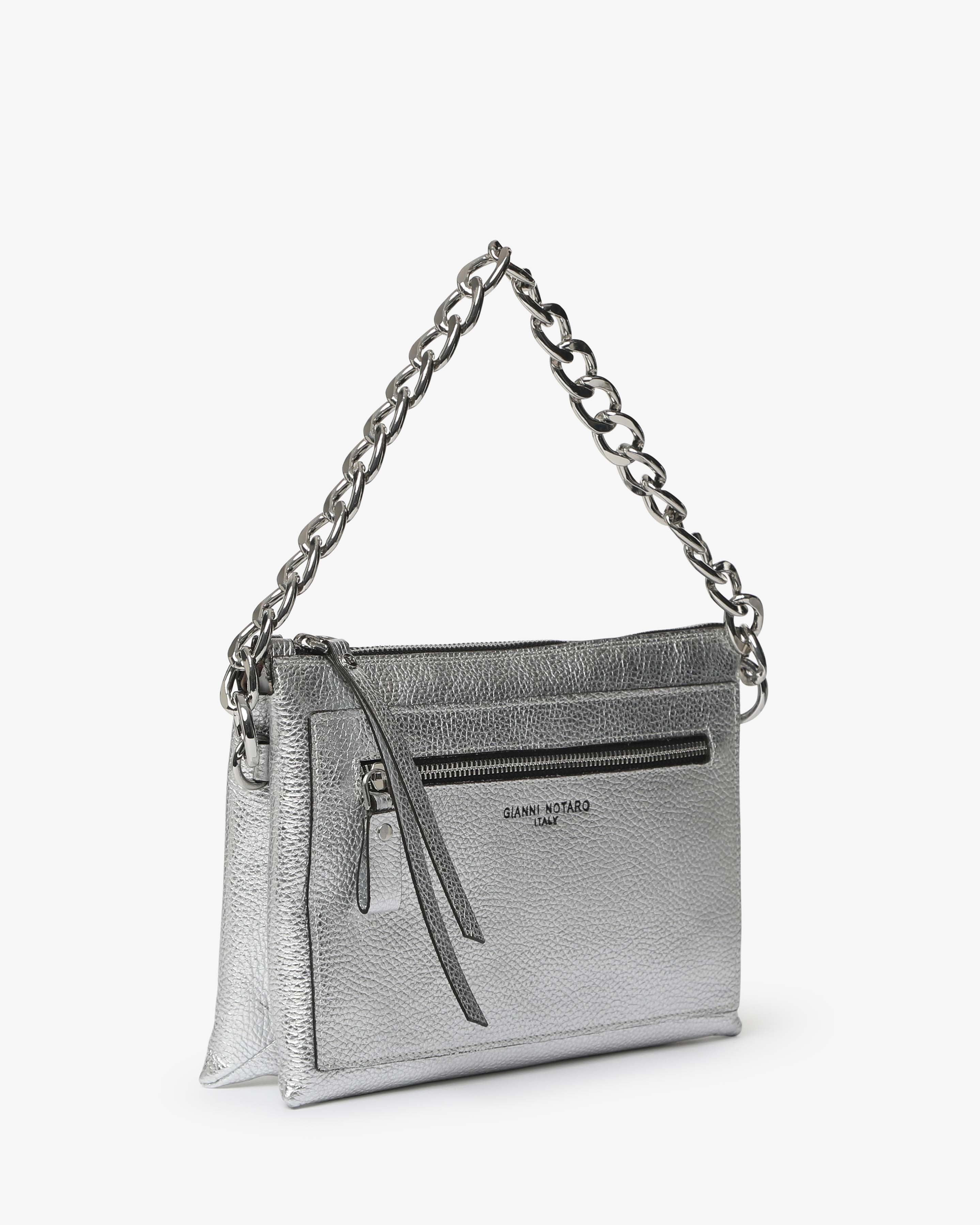 Athena è la borsa a spalla in pelle martellata dal design elegante e contemporaneo. Dotata di tracolla in catena e dettagli zip frontale, unisce praticità e stile per un look sofisticato, da giorno e sera.