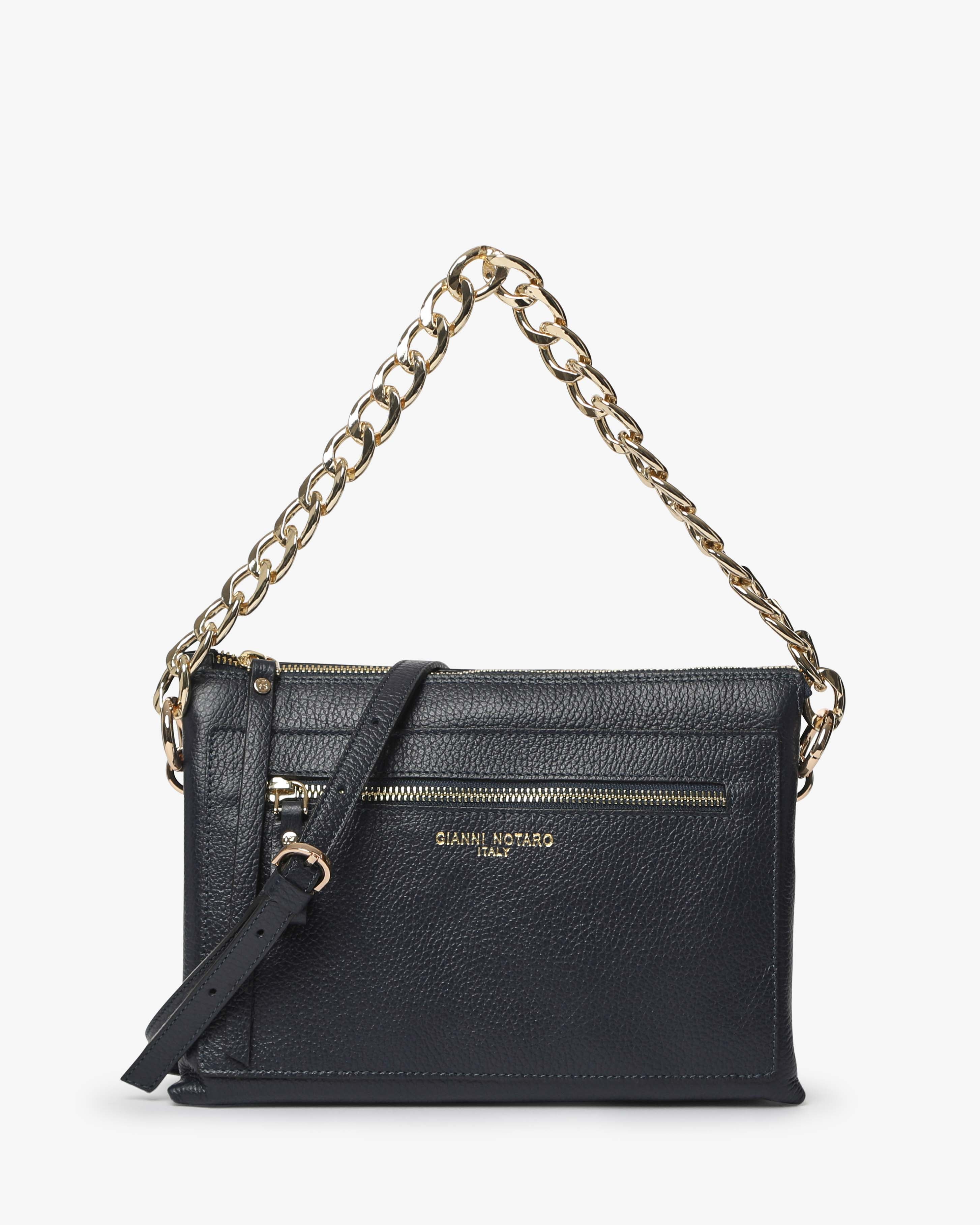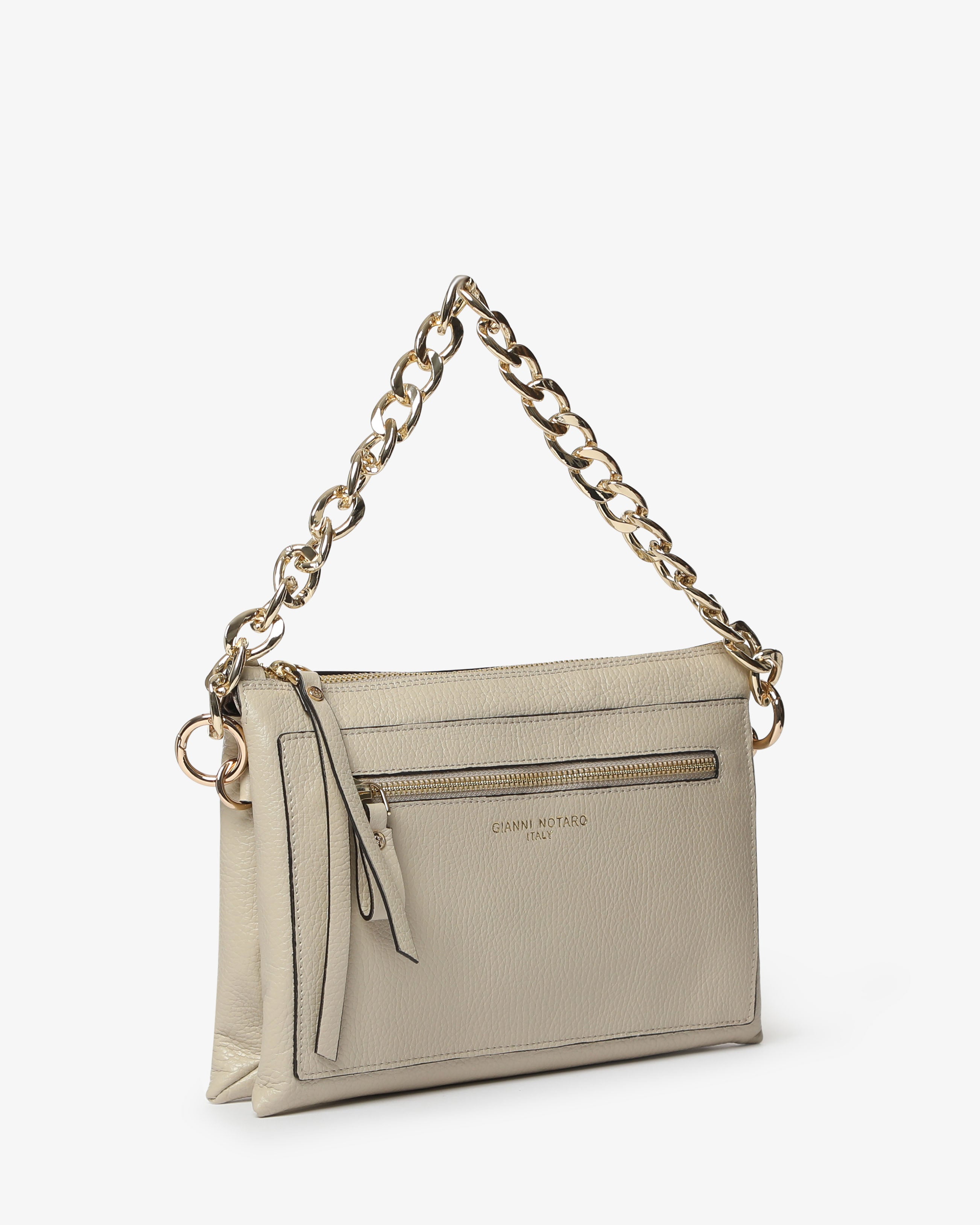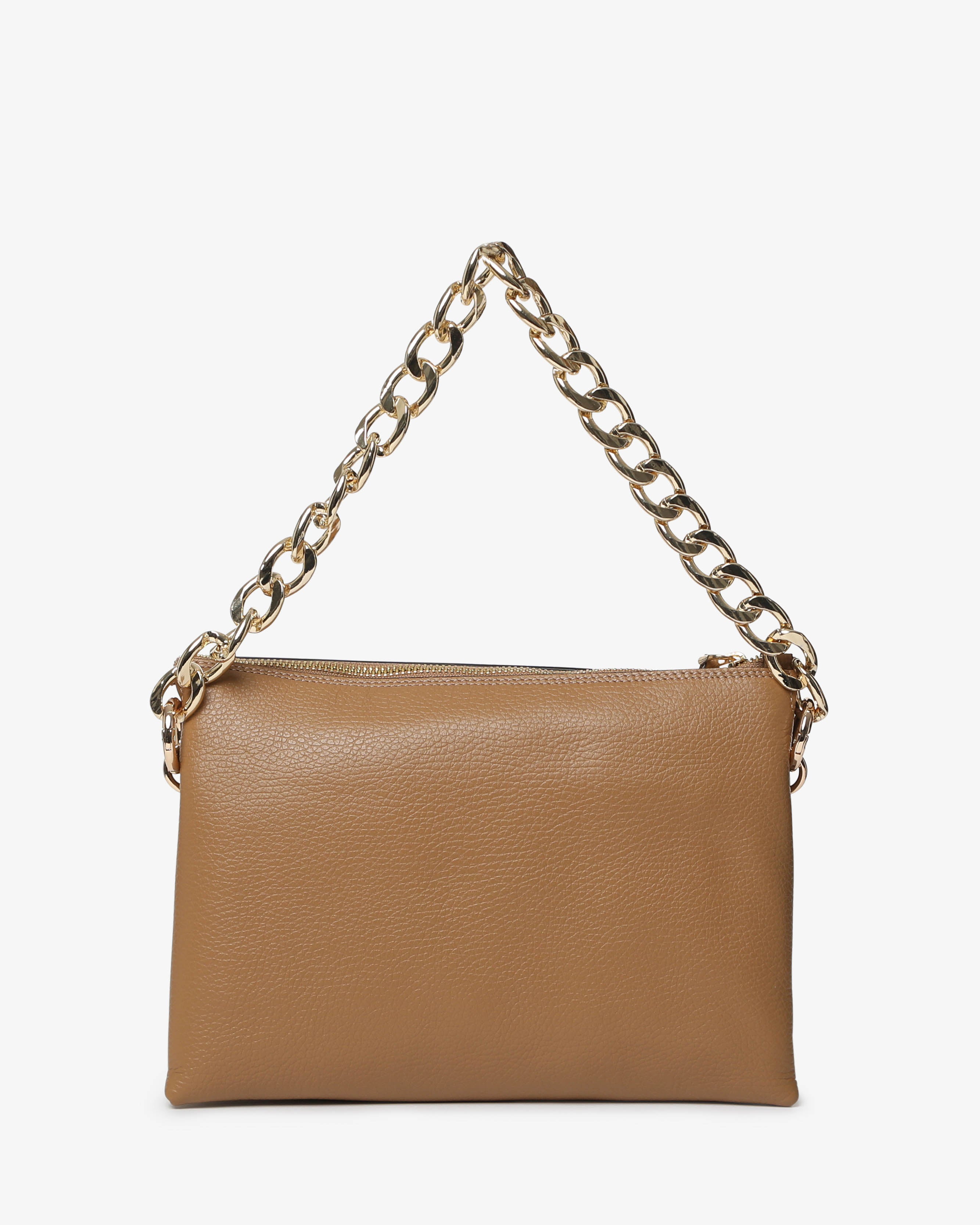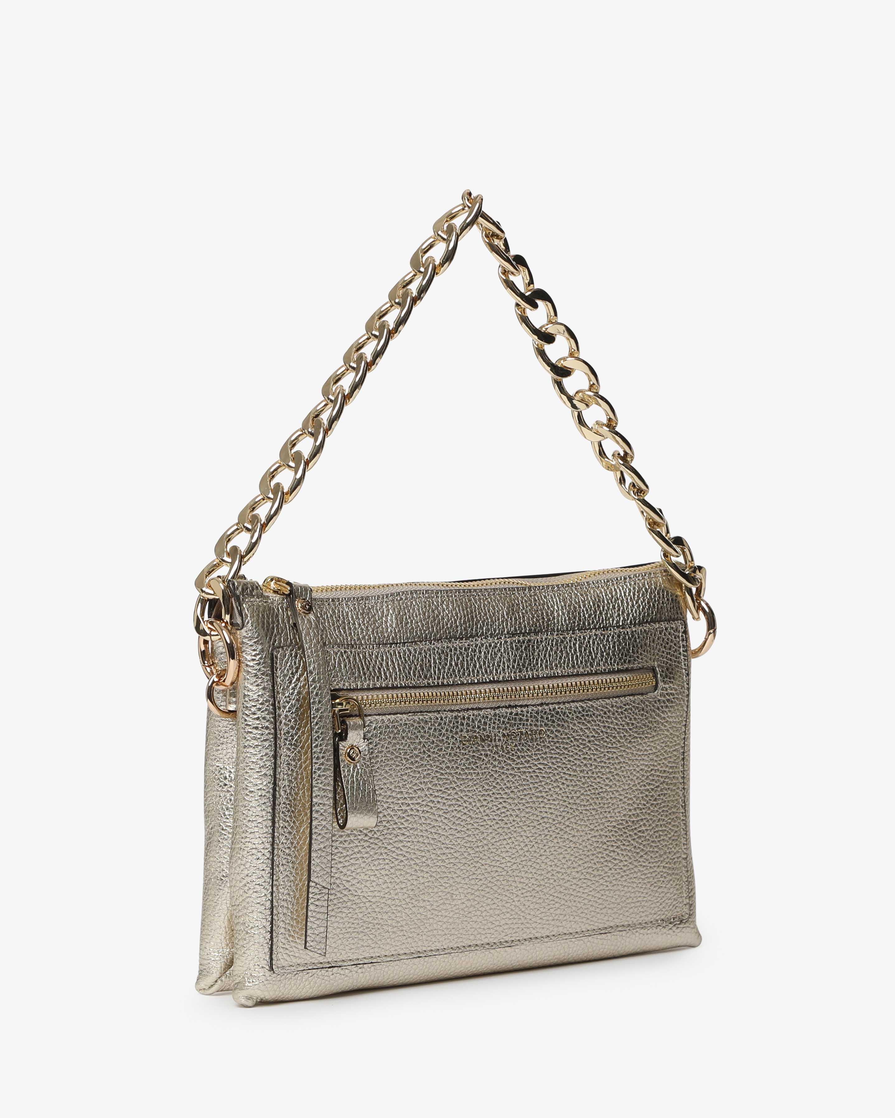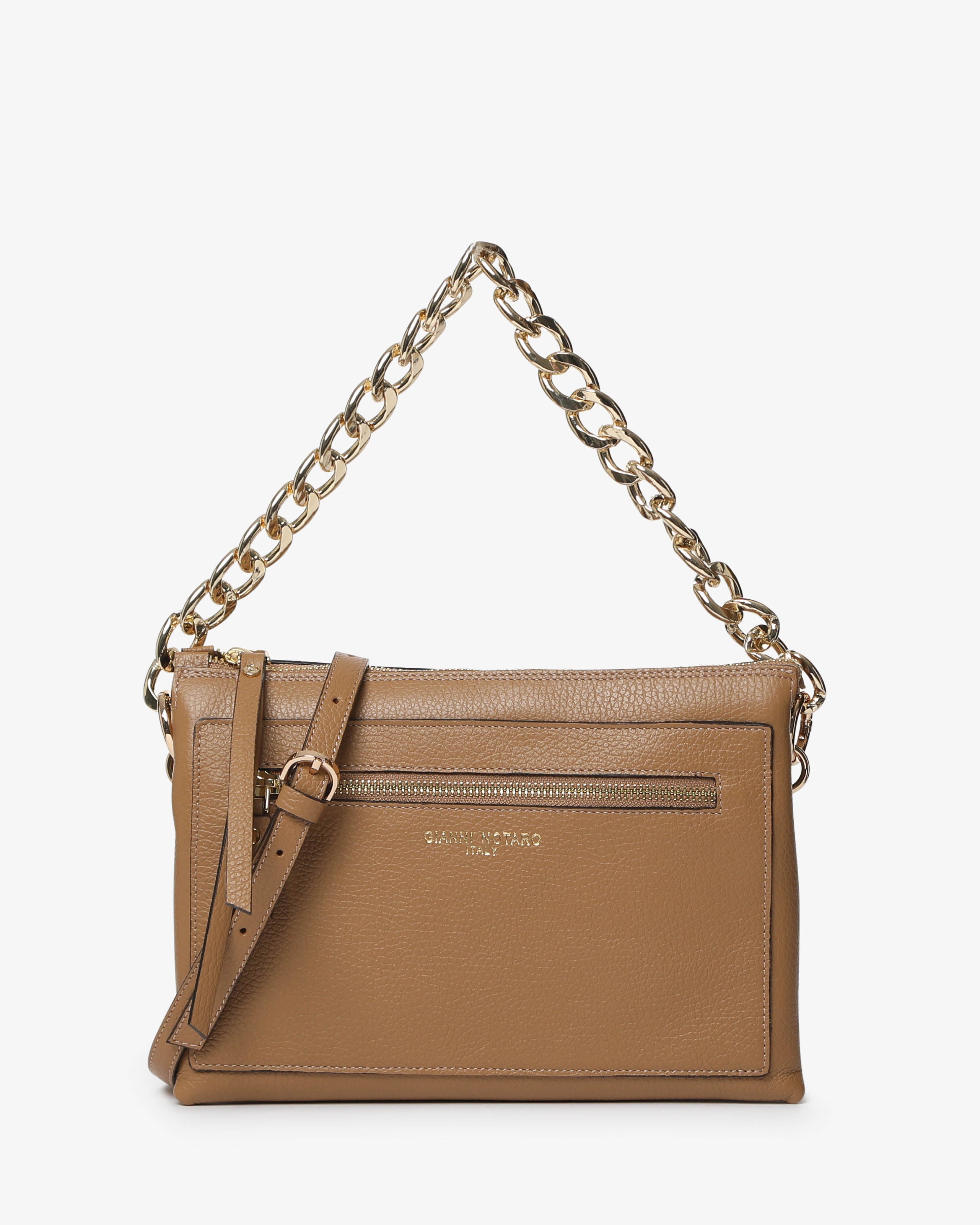 Athena è la borsa a spalla in pelle martellata dal design elegante e contemporaneo. Dotata di tracolla in catena e dettagli zip frontale, unisce praticità e stile per un look sofisticato, da giorno e sera.