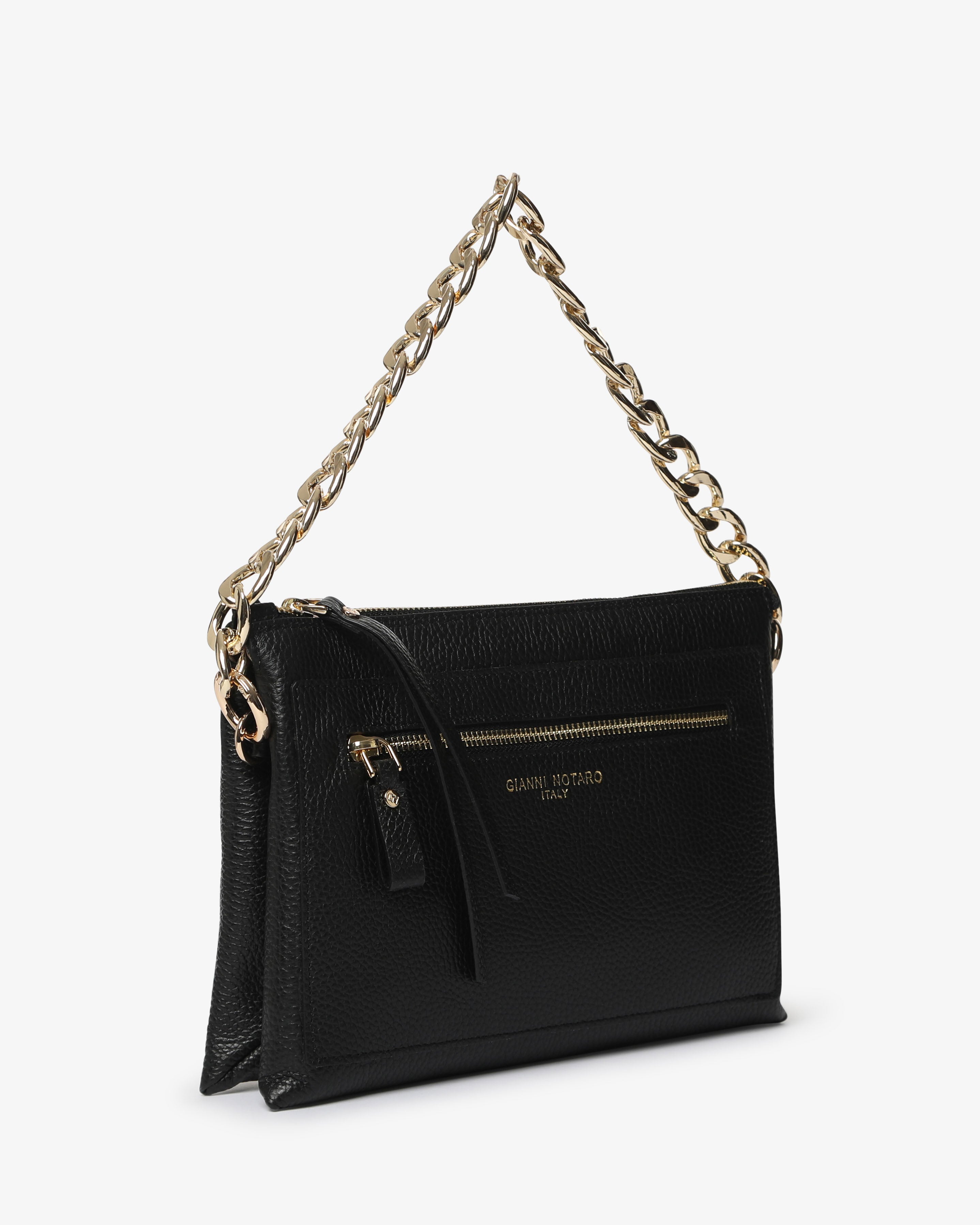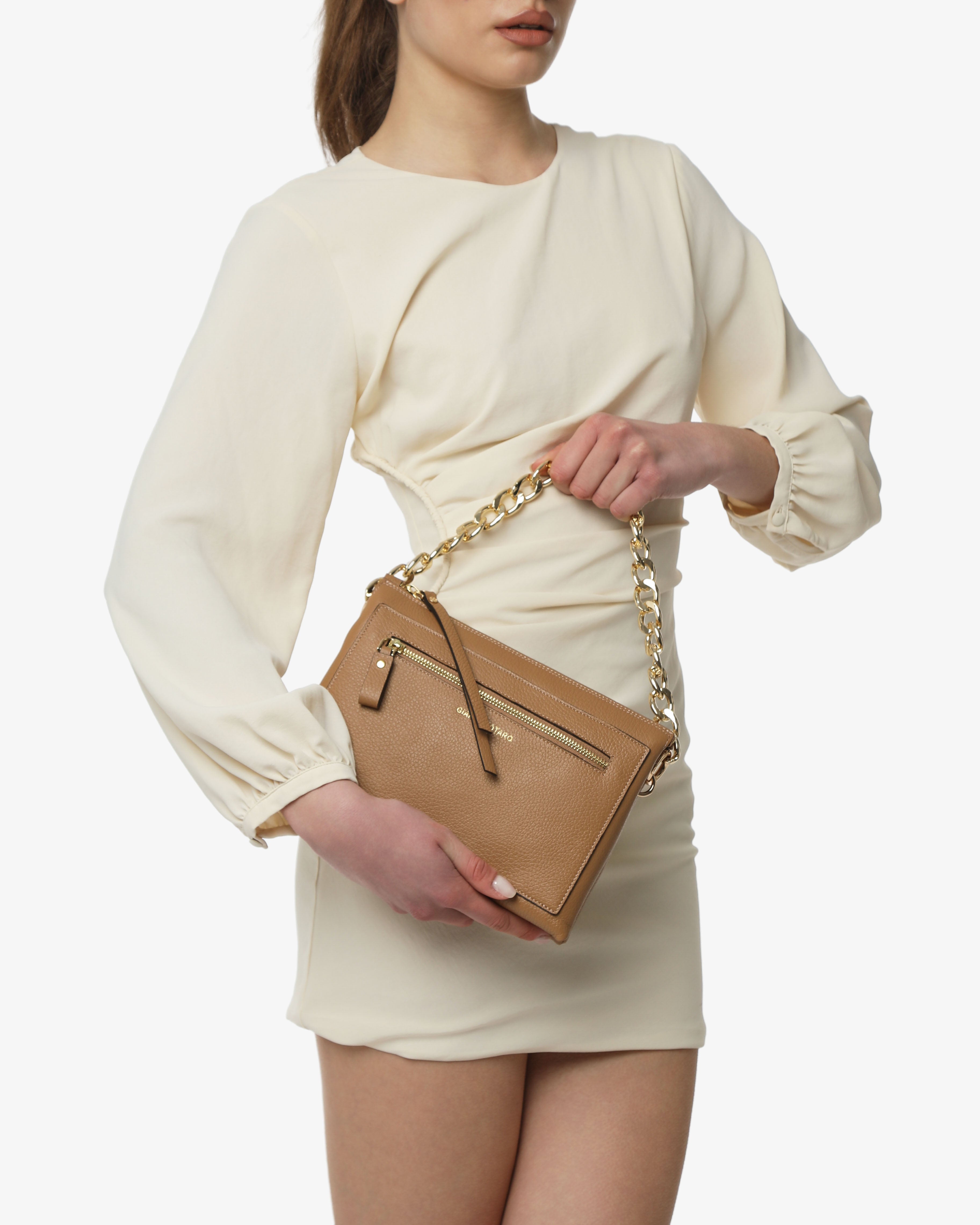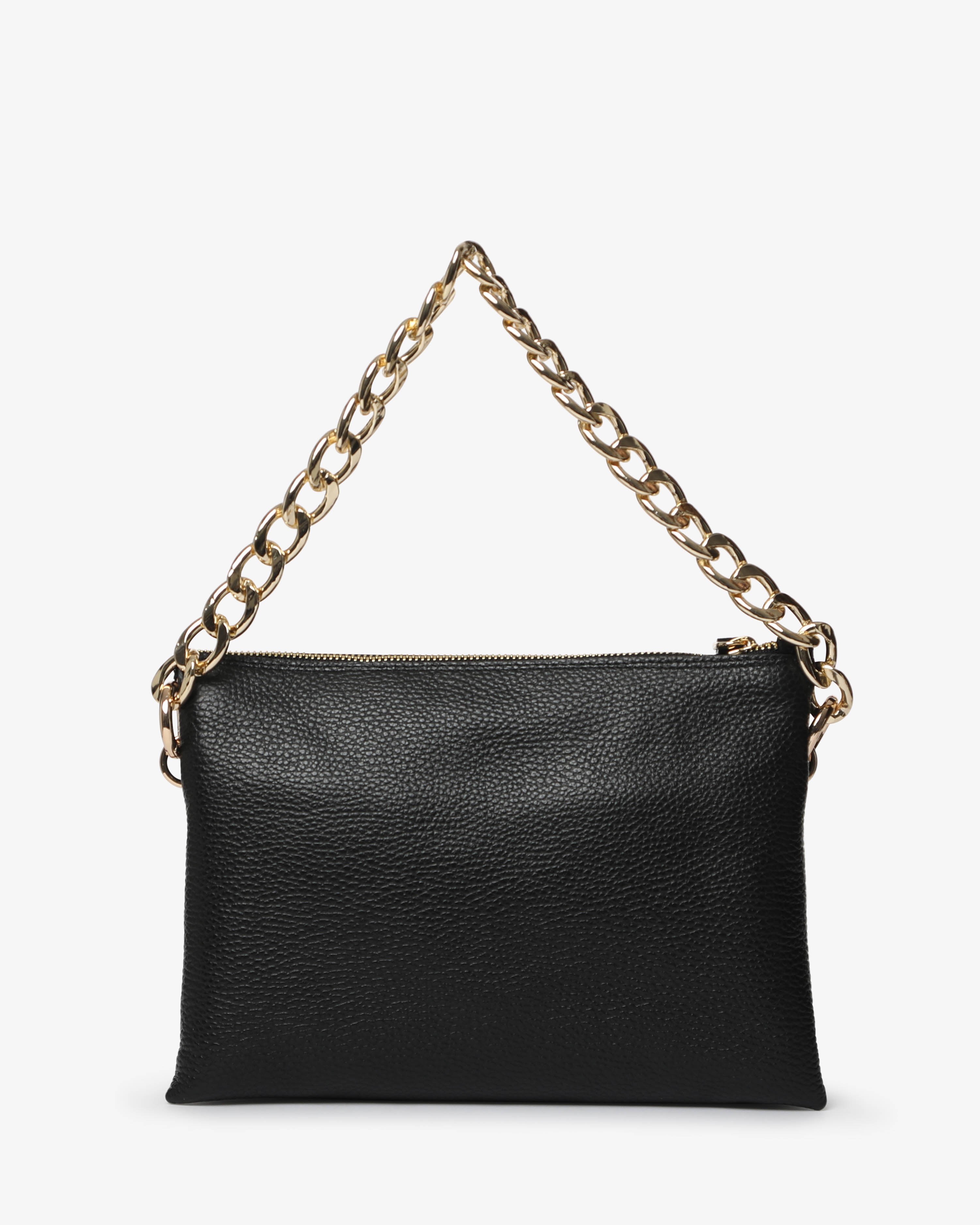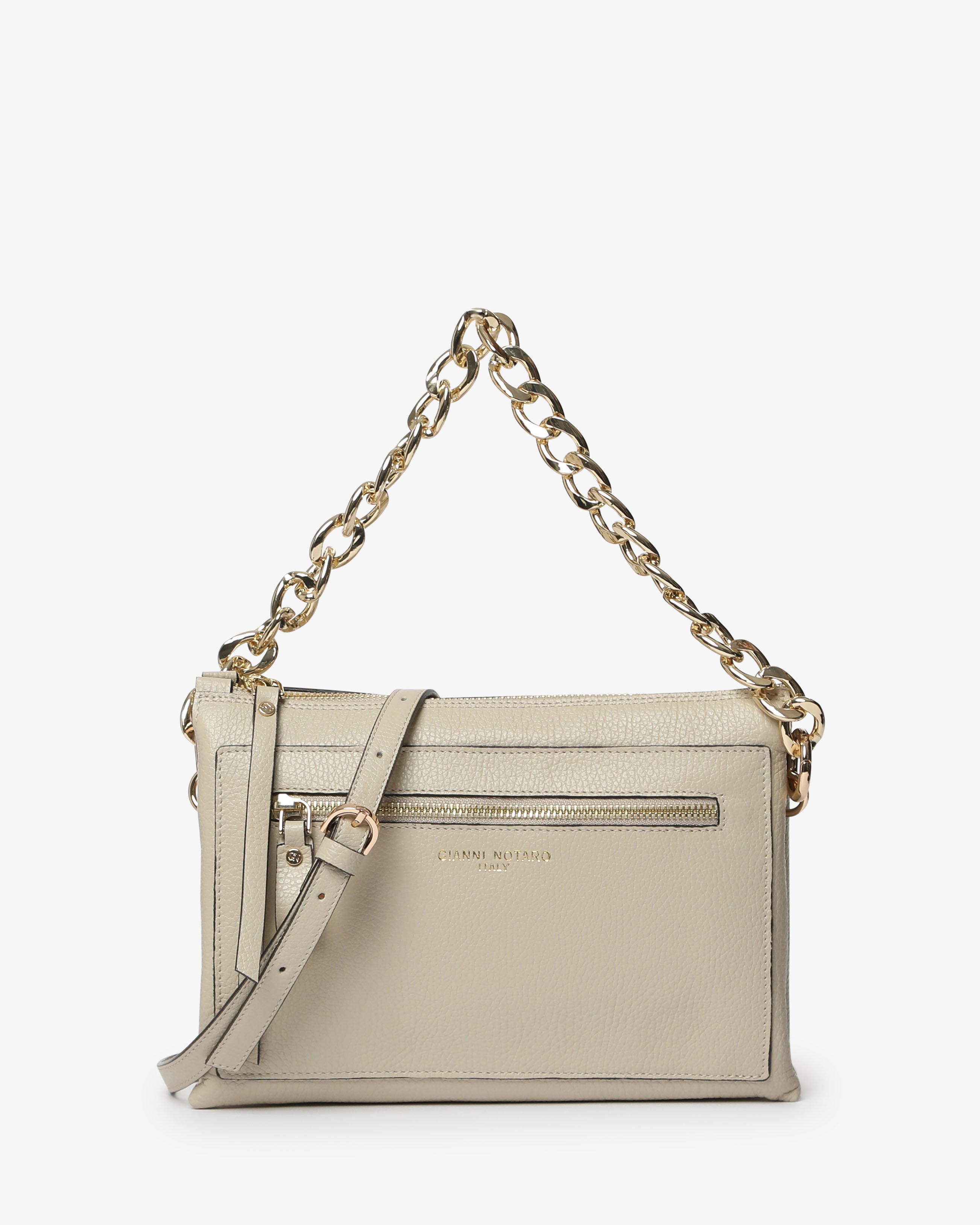 Athena è la borsa a spalla in pelle martellata dal design elegante e contemporaneo. Dotata di tracolla in catena e dettagli zip frontale, unisce praticità e stile per un look sofisticato, da giorno e sera.
