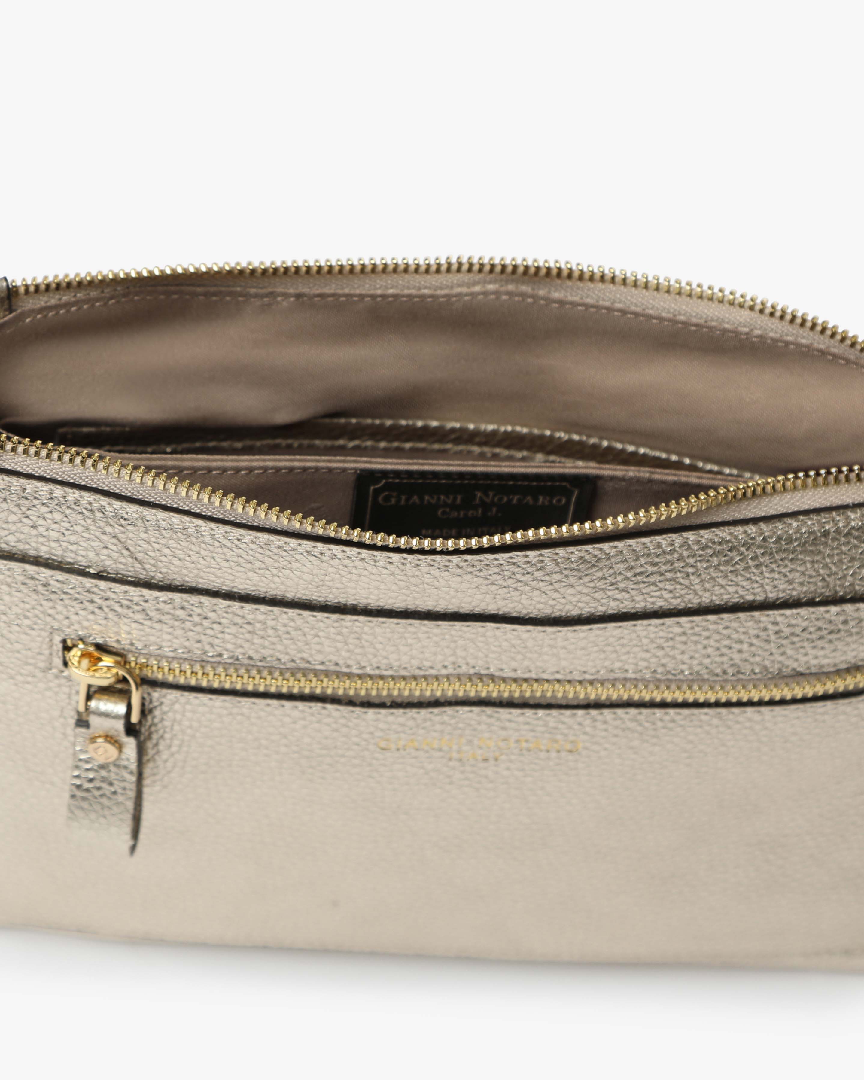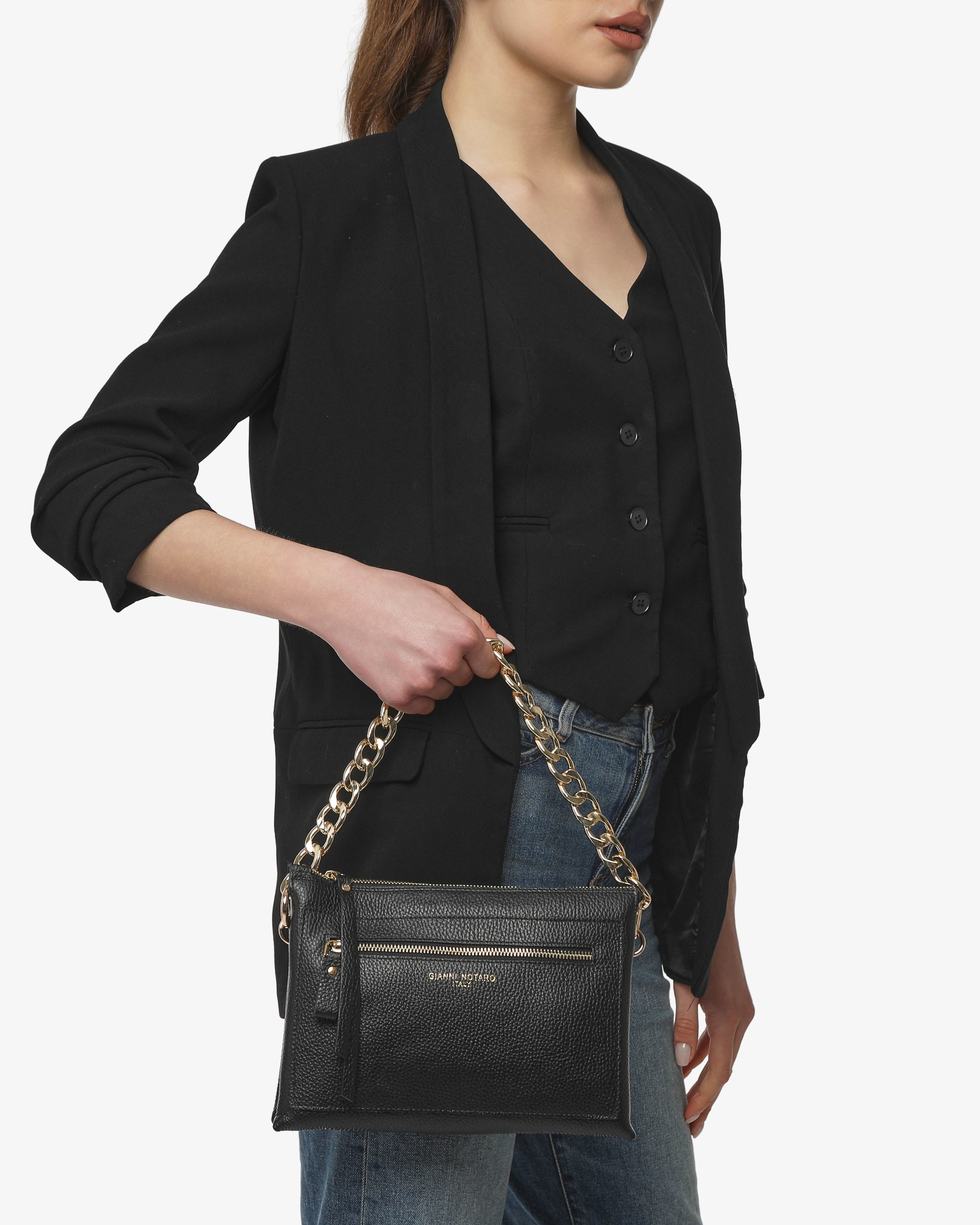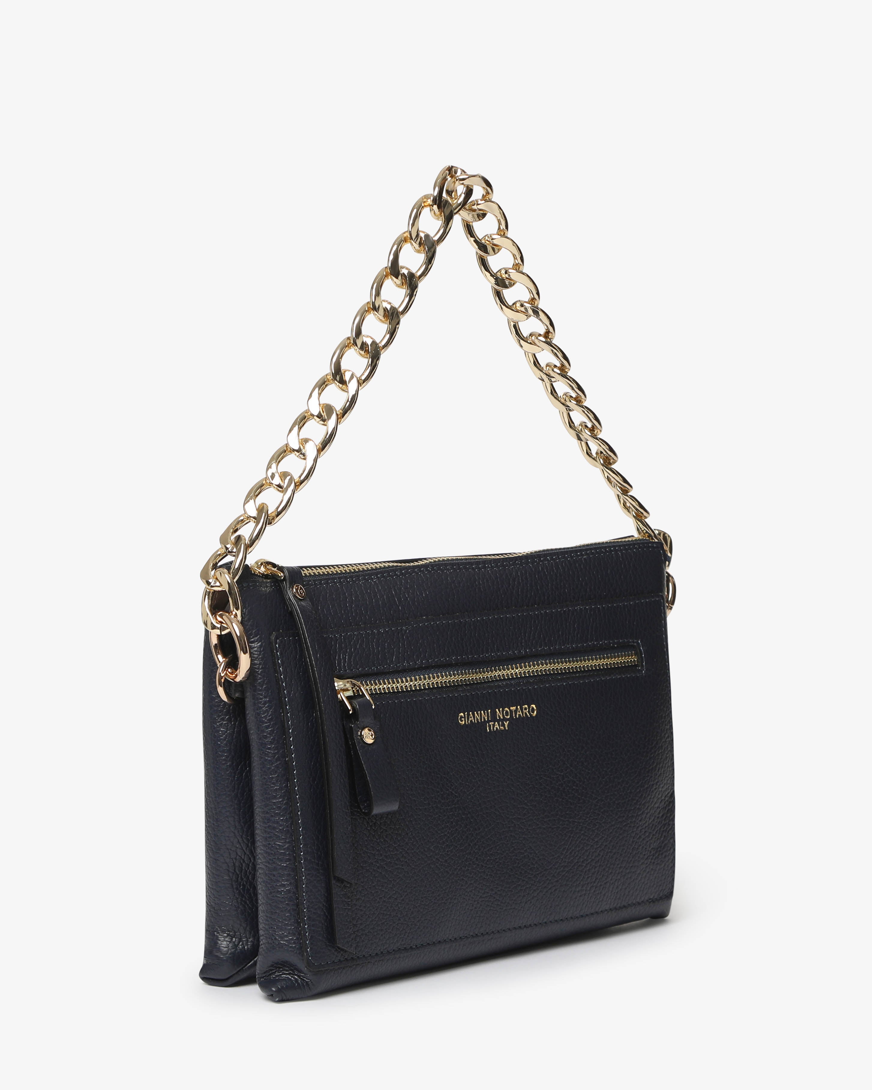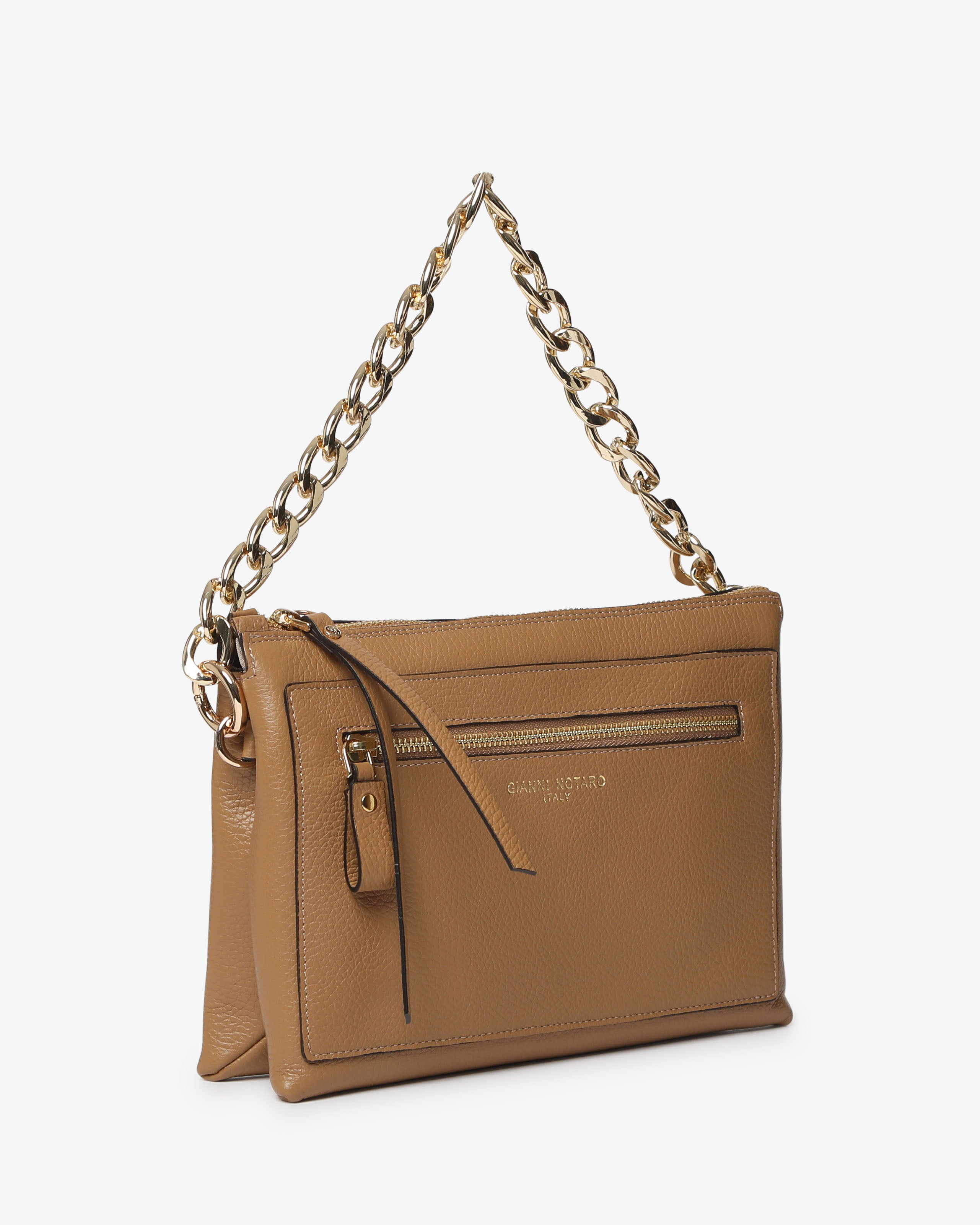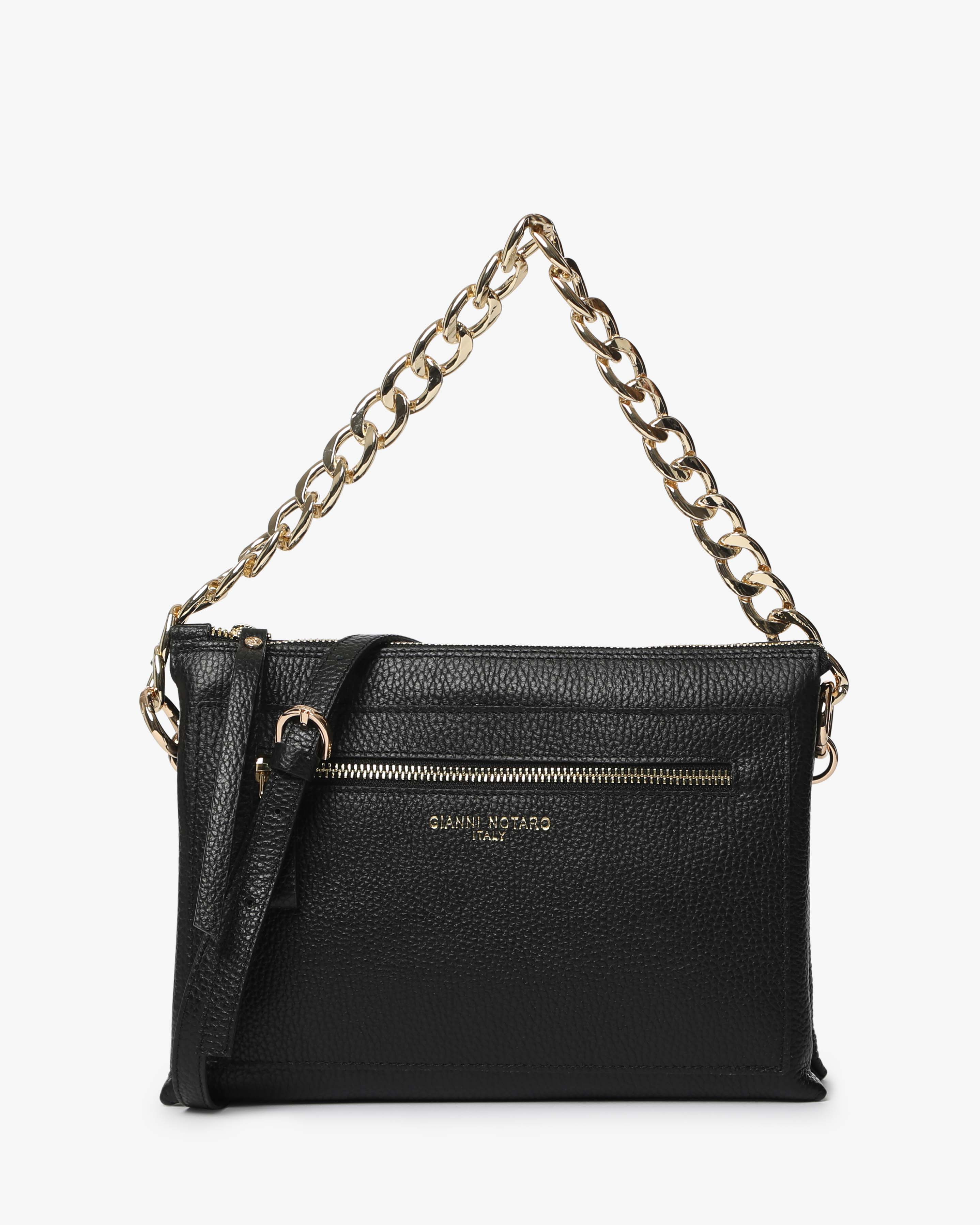 Athena è la borsa a spalla in pelle martellata dal design elegante e contemporaneo. Dotata di tracolla in catena e dettagli zip frontale, unisce praticità e stile per un look sofisticato, da giorno e sera.