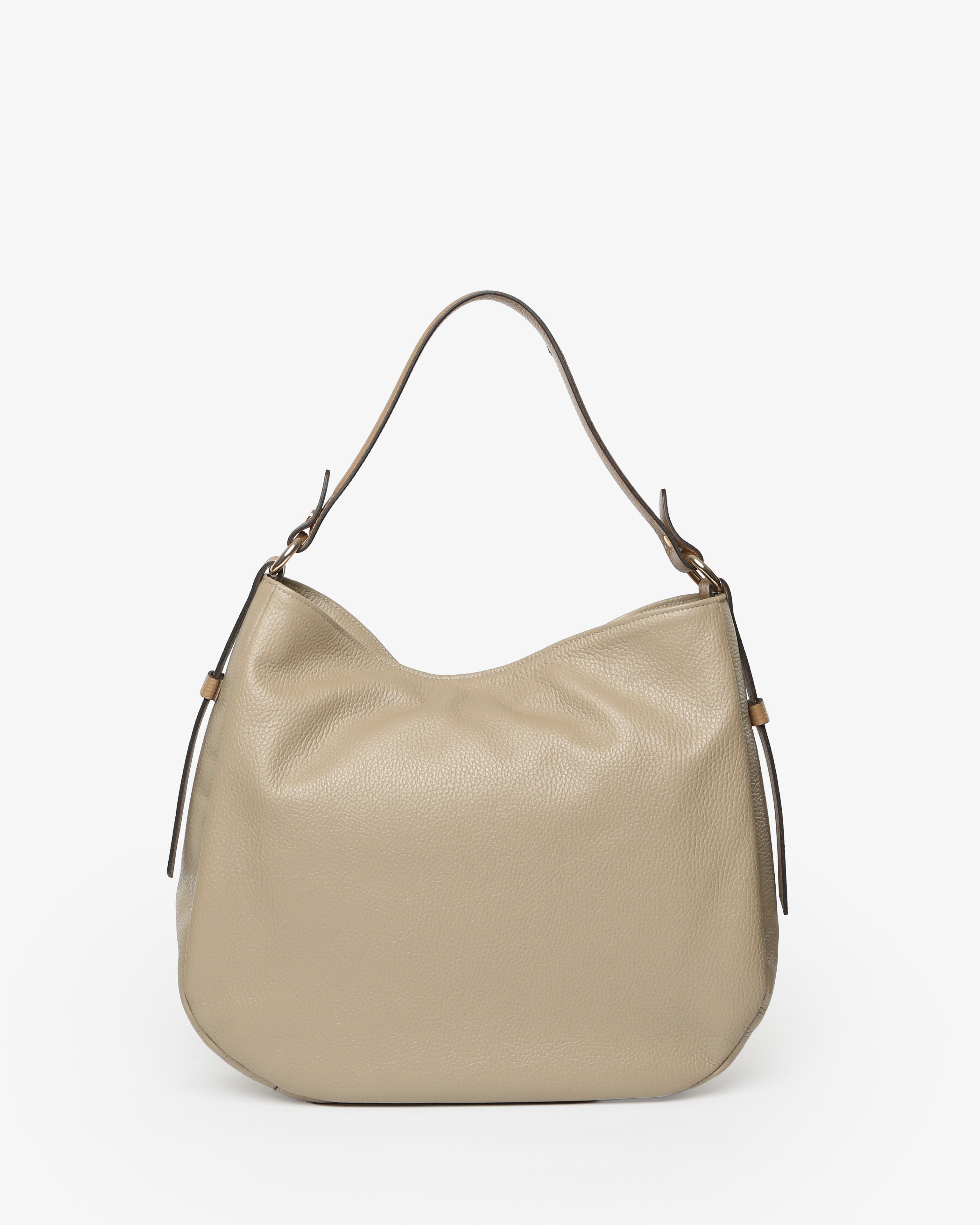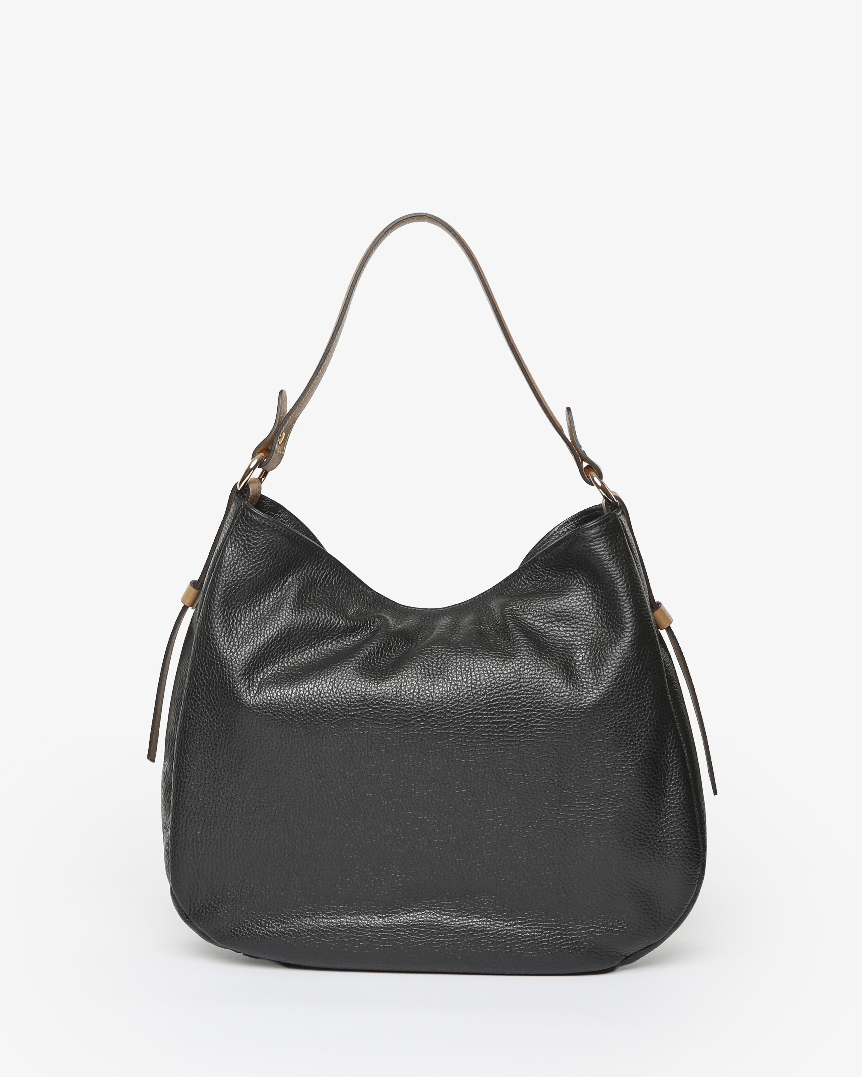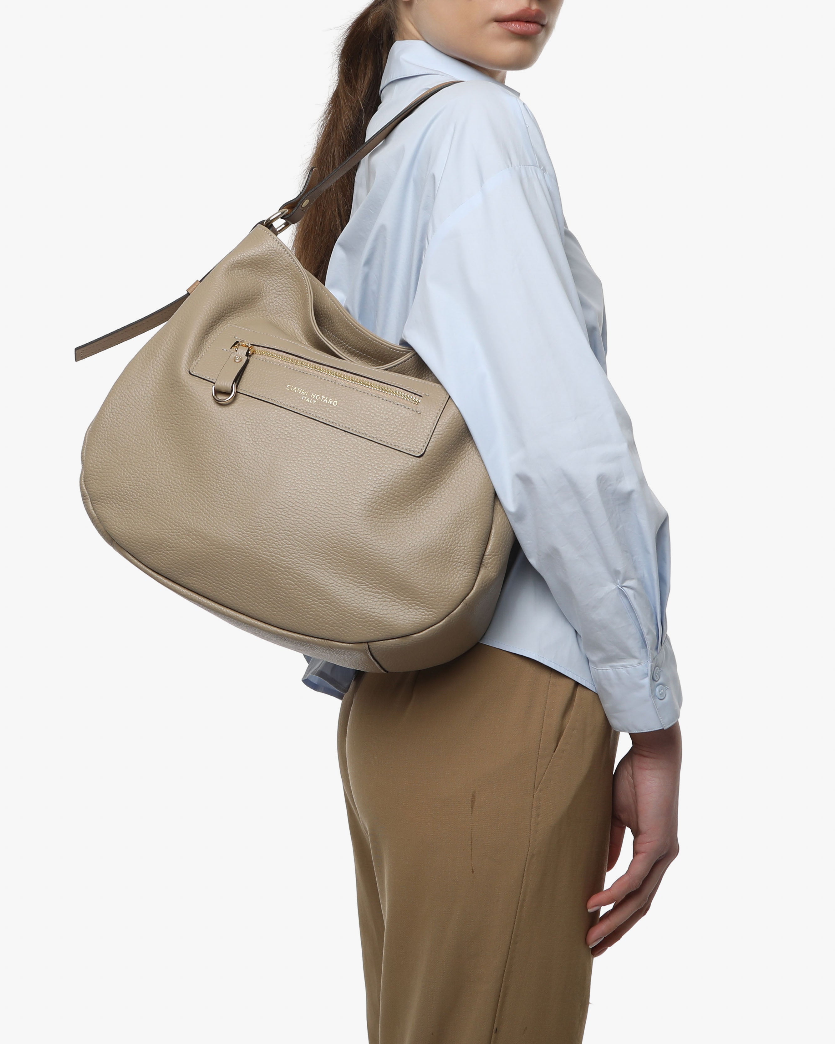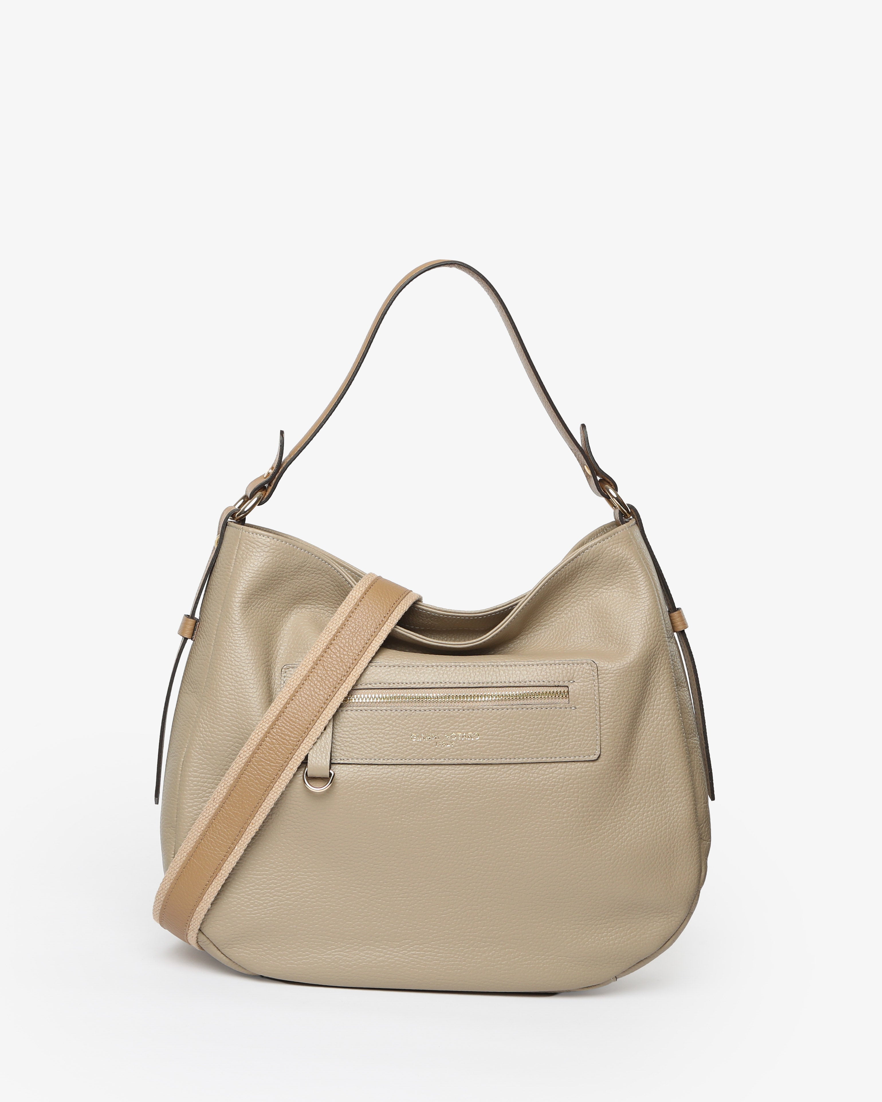 Ella è la borsa Hobo in pelle martellata dollaro, dal design morbido ed elegante. Dotata di manico a spalla, tracolla regolabile e tasca frontale con zip per unire stile e funzionalità.