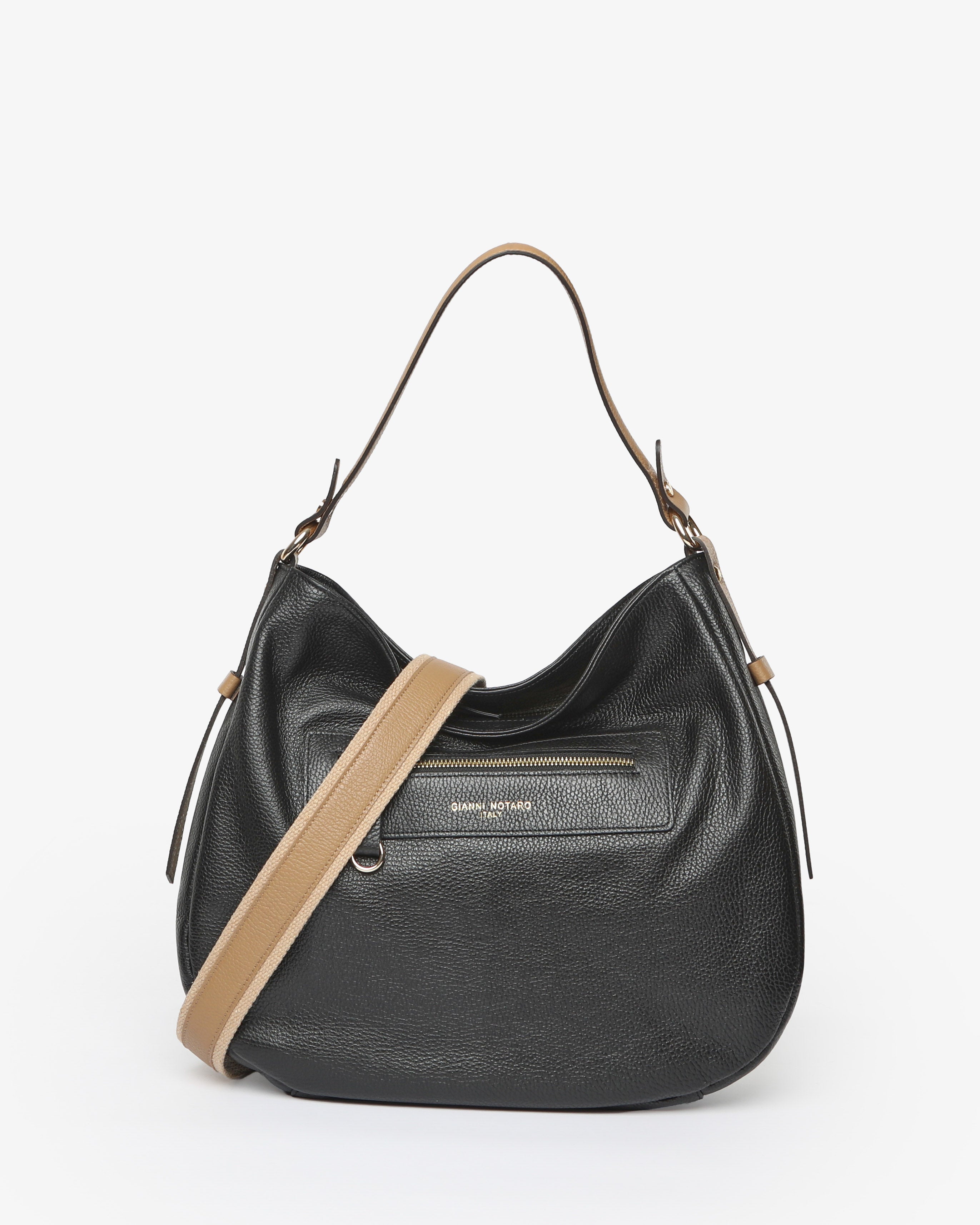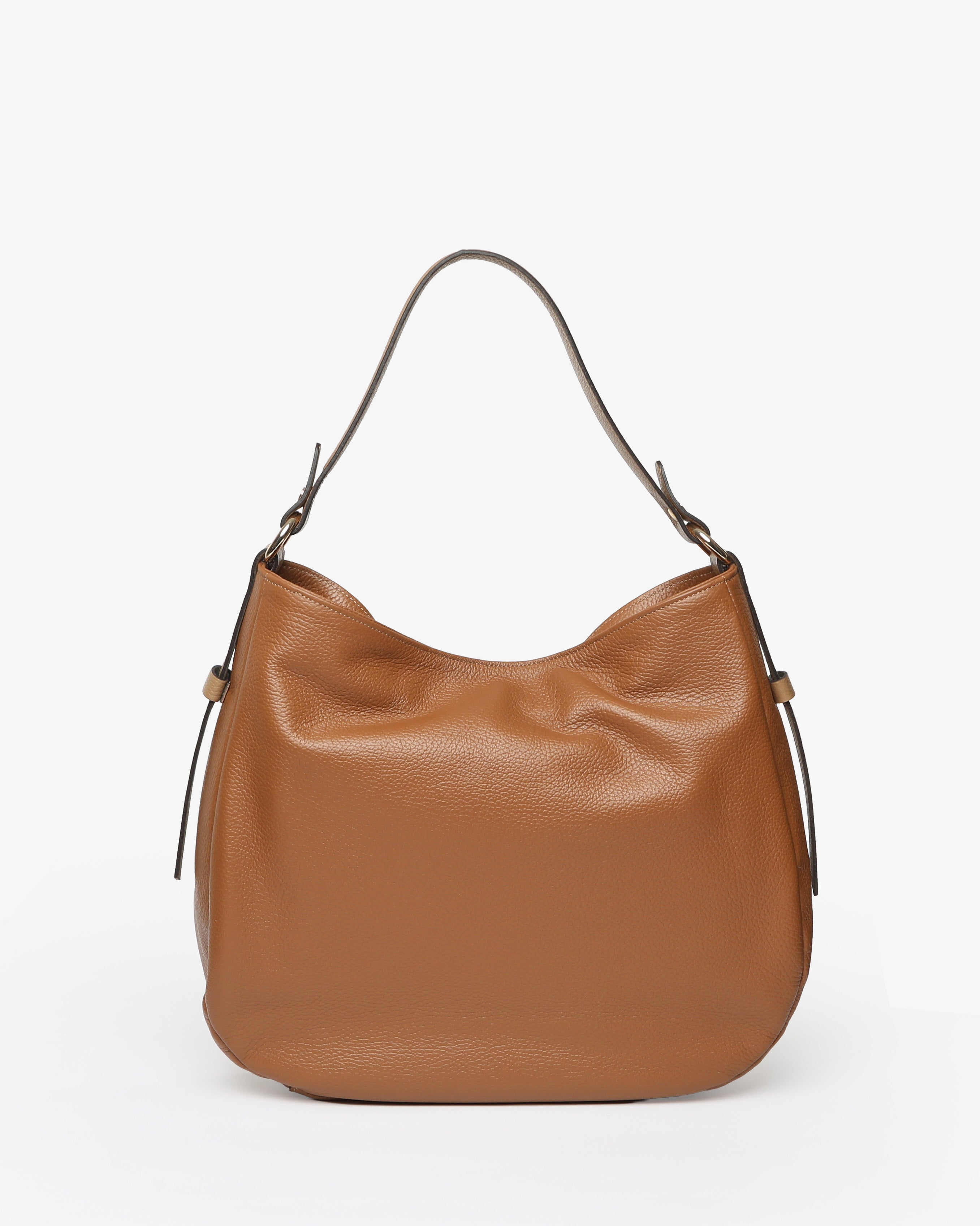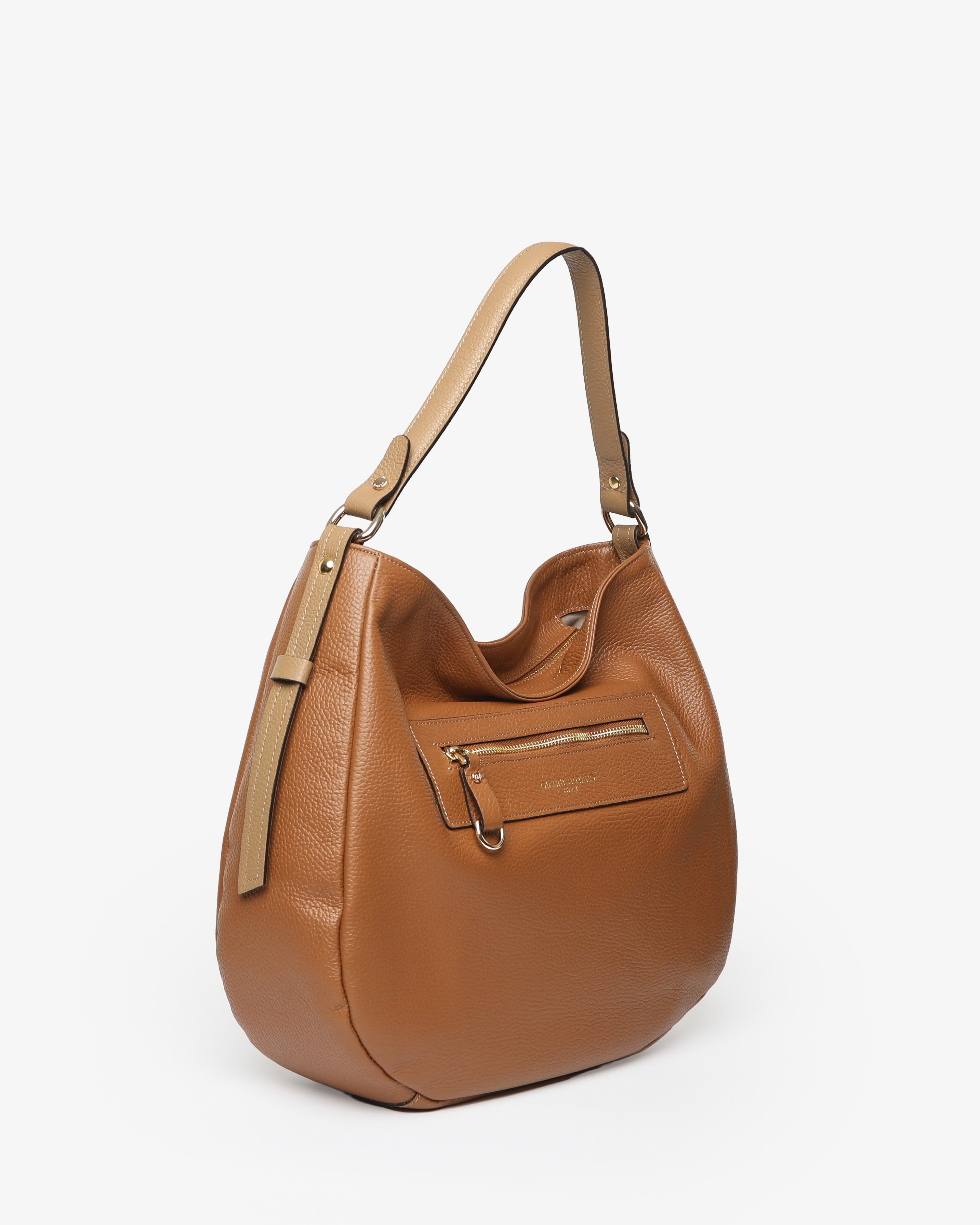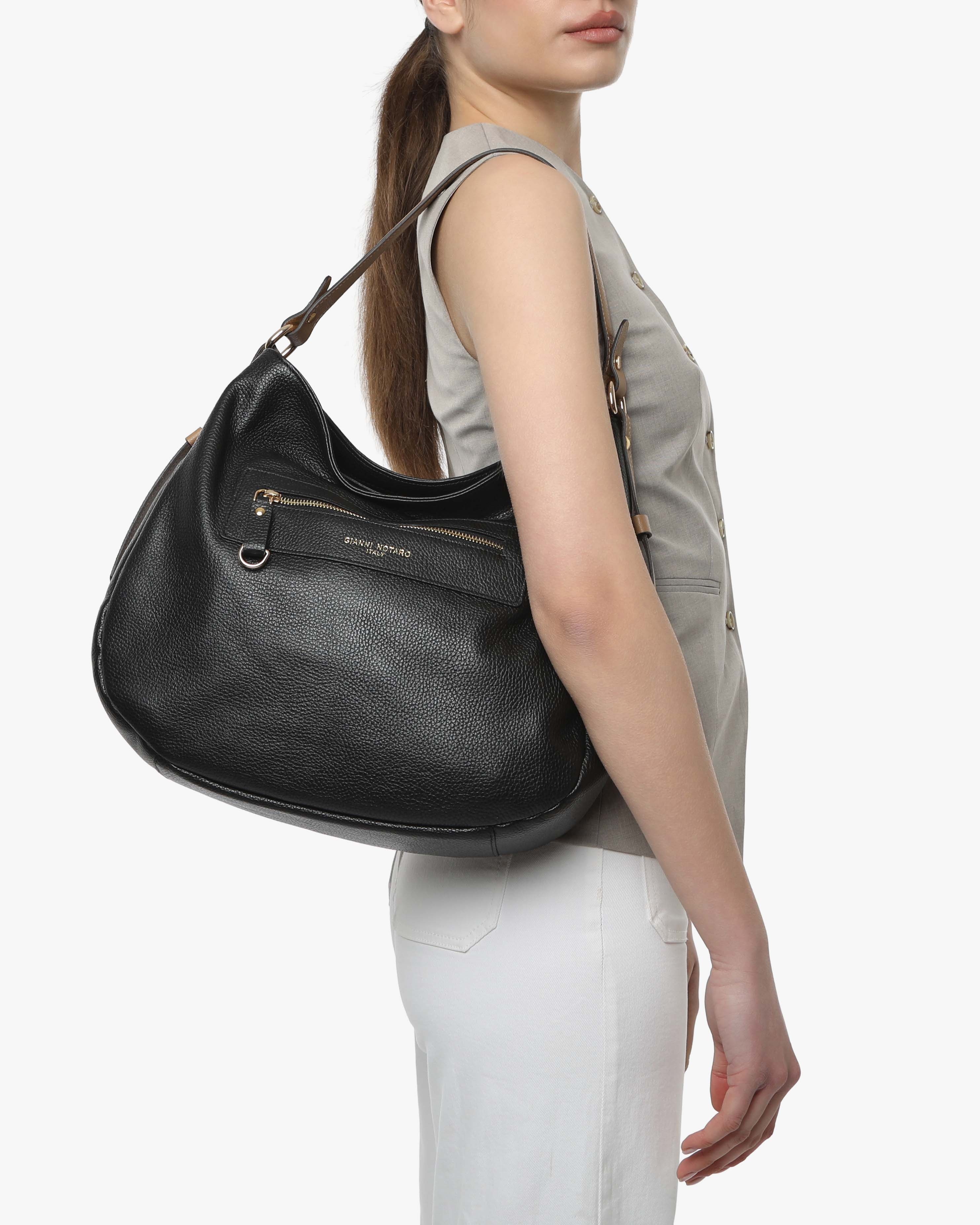 Ella è la borsa Hobo in pelle martellata dollaro, dal design morbido ed elegante. Dotata di manico a spalla, tracolla regolabile e tasca frontale con zip per unire stile e funzionalità.