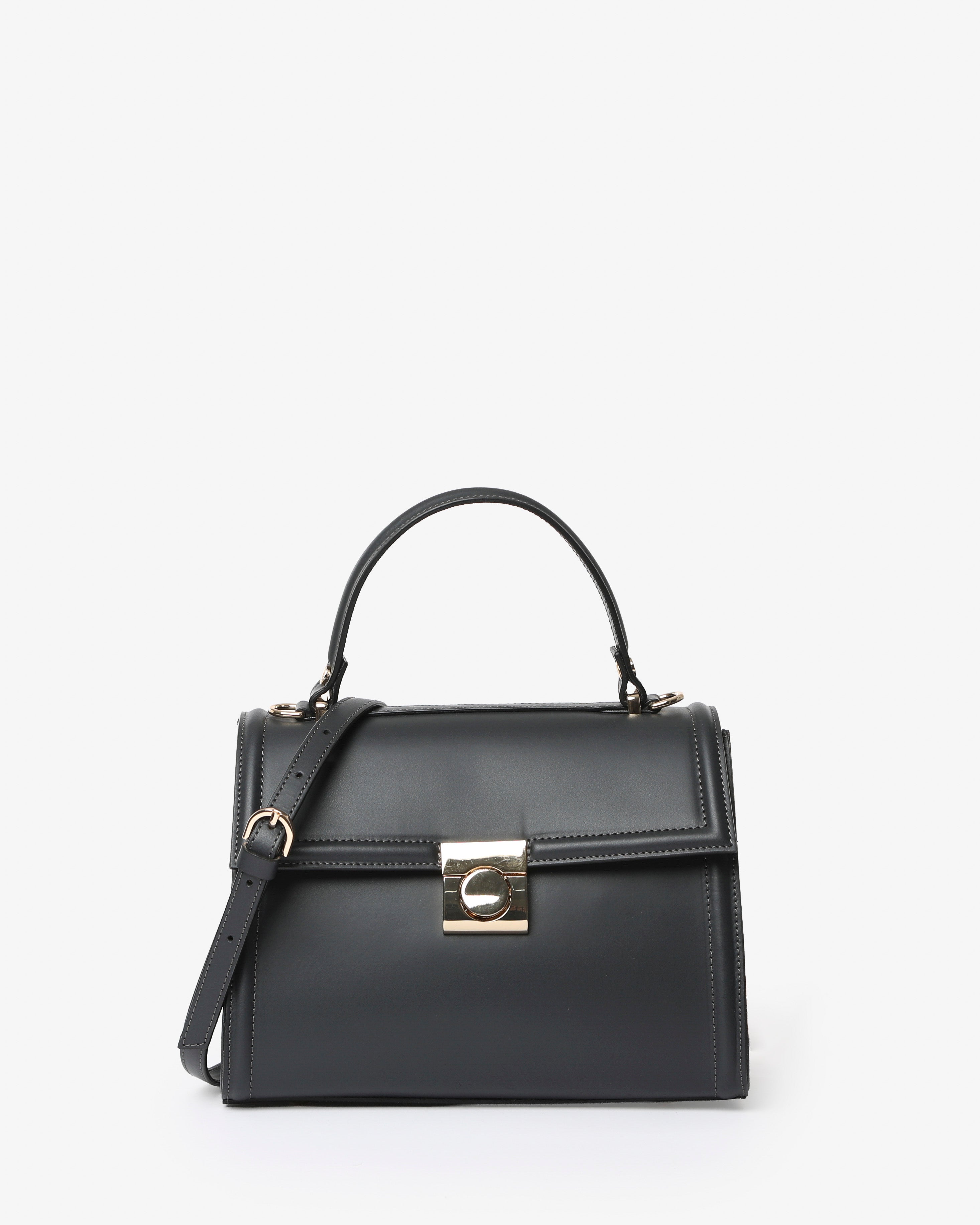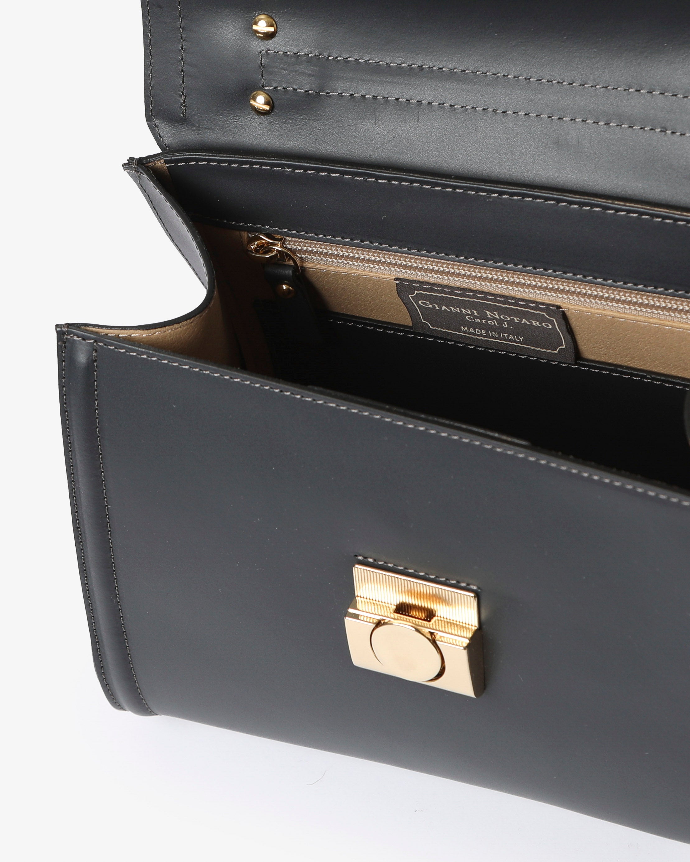 Un'icona di eleganza contemporanea firmata Gianni Notaro. Realizzata in vera pelle ruga di alta qualità, questa borsa a mano presenta linee pulite e geometriche, impreziosite dalla chiusura metallica dorata che ne esalta il carattere sofisticato. Può essere indossata a mano o con la tracolla regolabile e rimovibile, ideale per un look raffinato da giorno o da sera. Perfettamente bilanciata tra stile e funzionalità, è un modello senza tempo pensato per la donna moderna.
