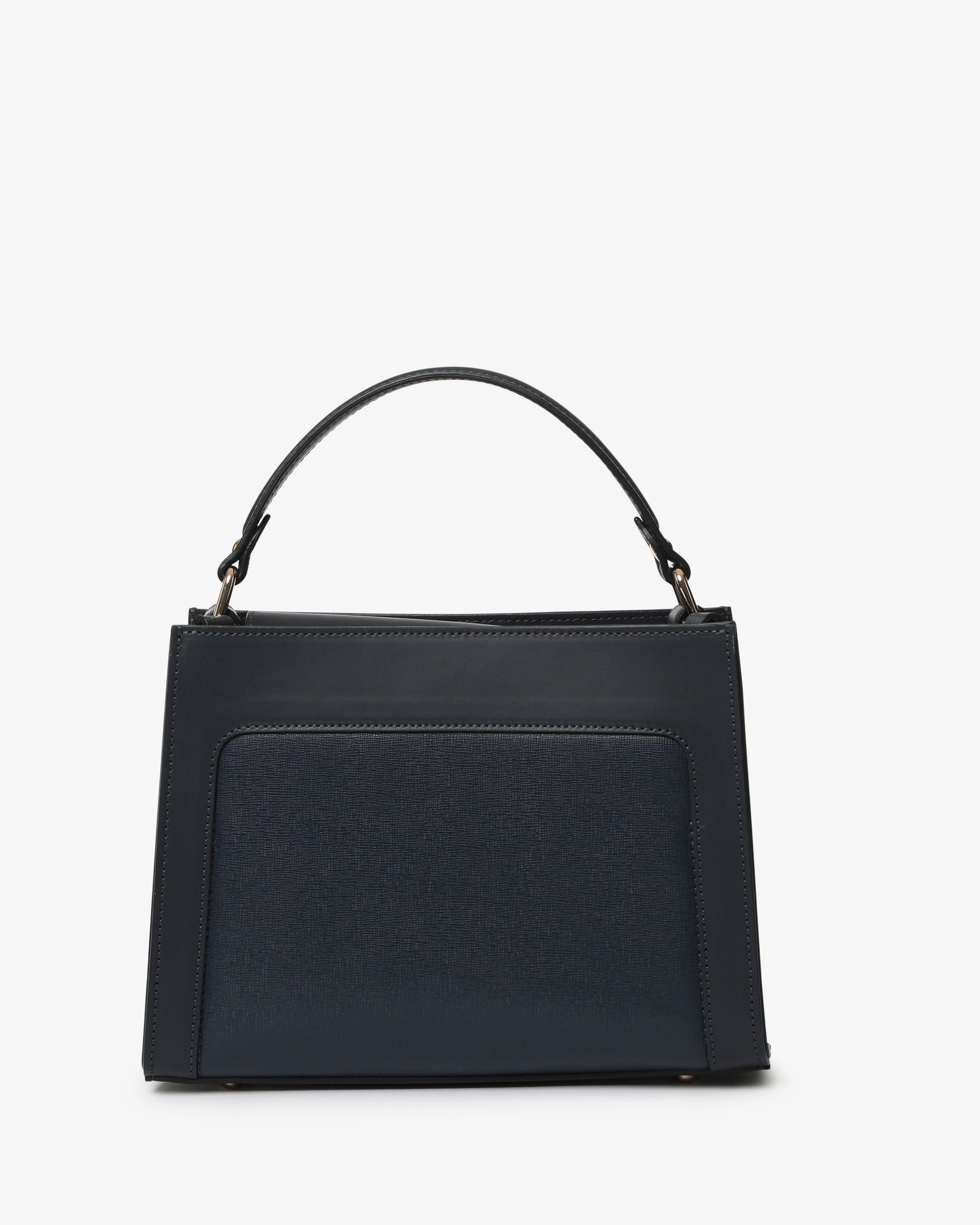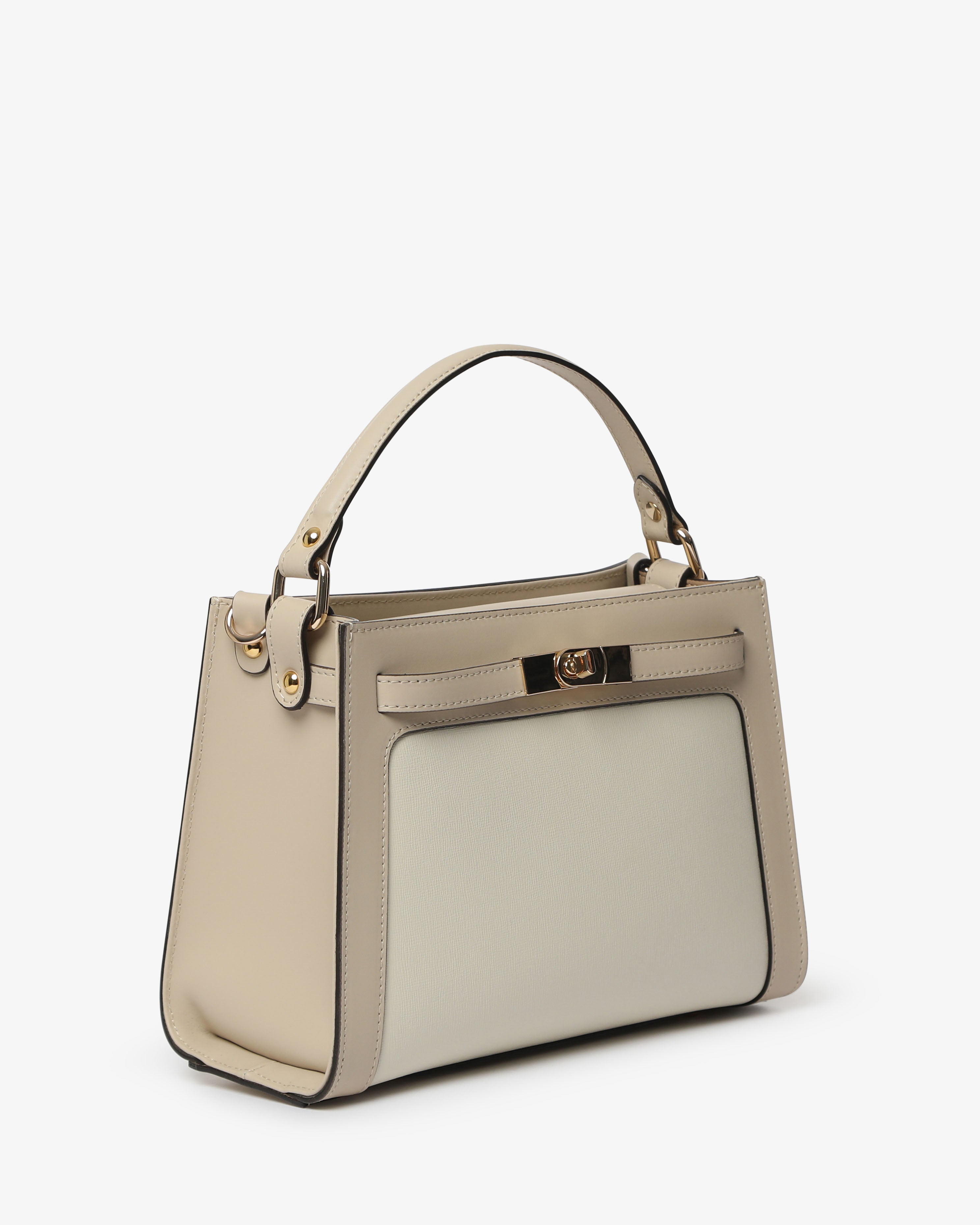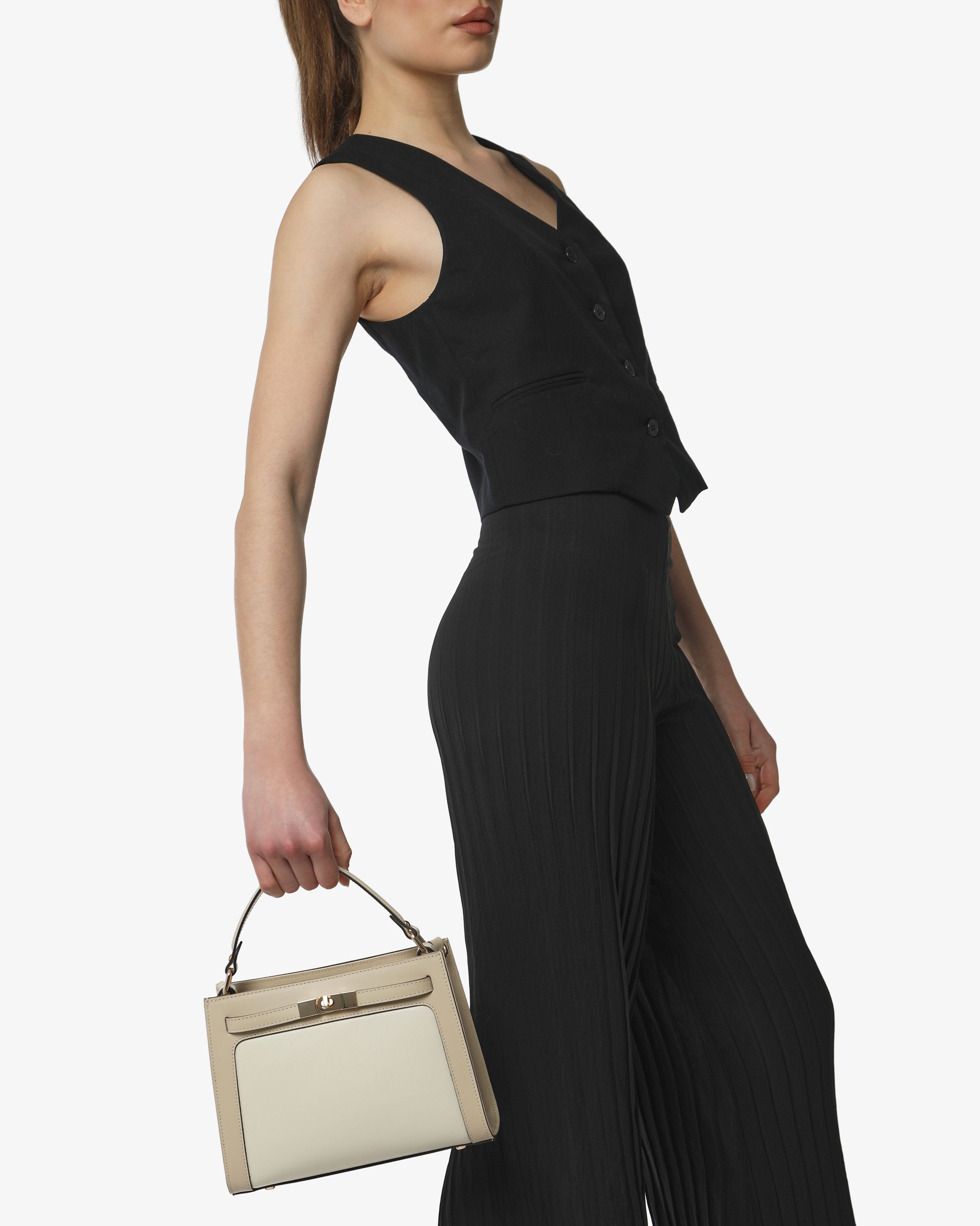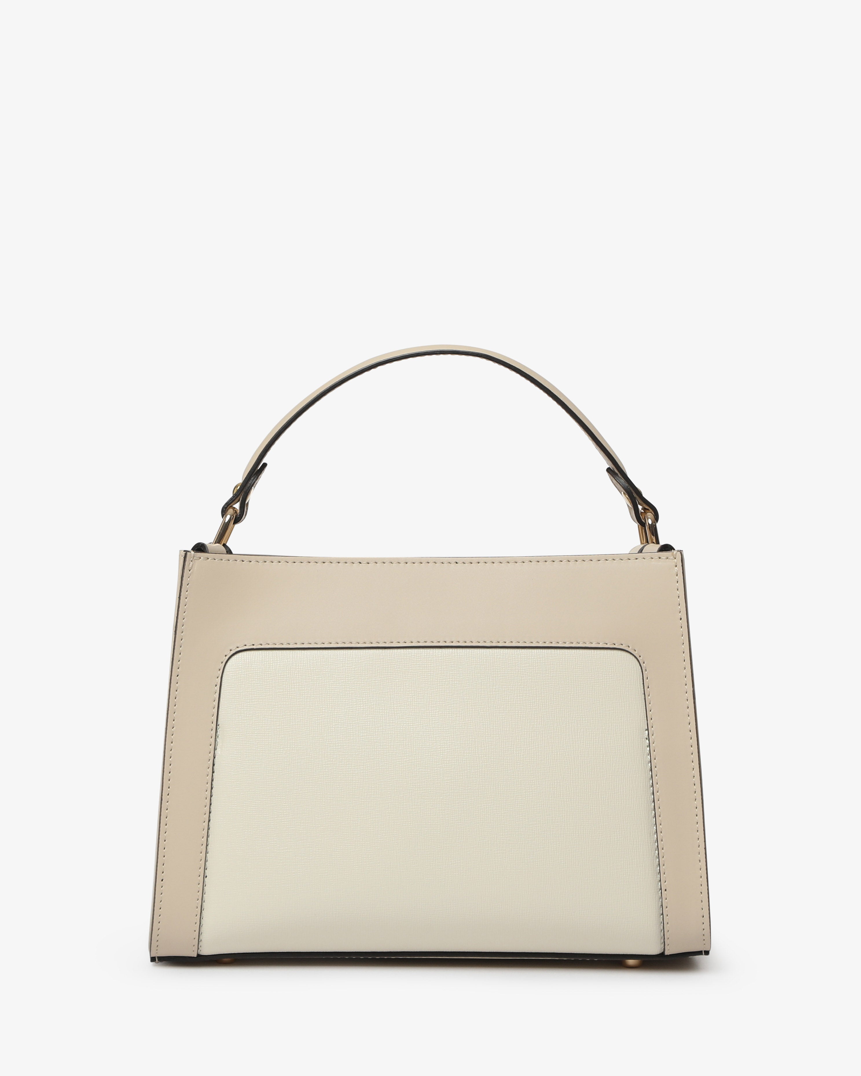 Violet è la borsa a mano in pelle ruga e davanti in saffiano, dal design elegante e strutturato, con chiusura frontale e pannello a contrasto. Dotata di manico superiore e tracolla regolabile, perfetta per un look raffinato e versatile.